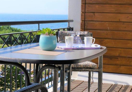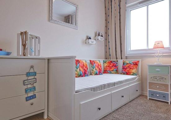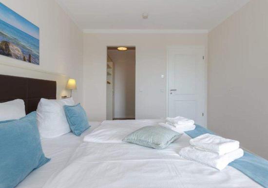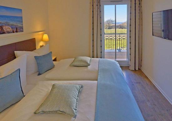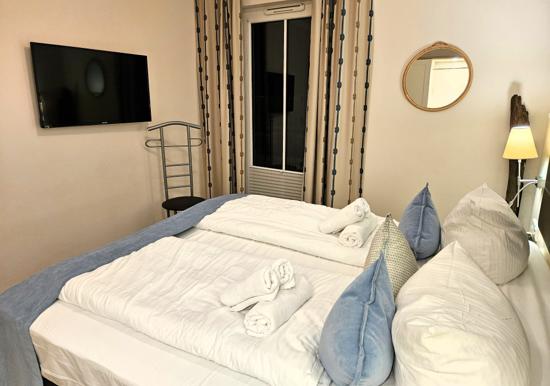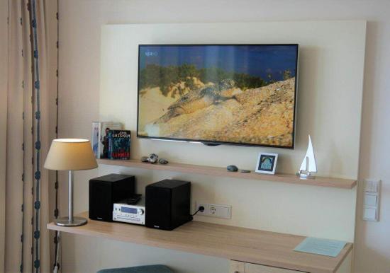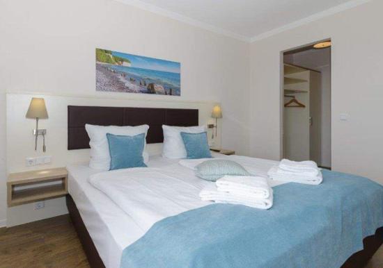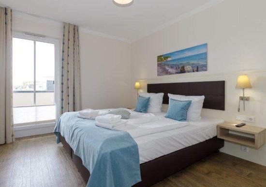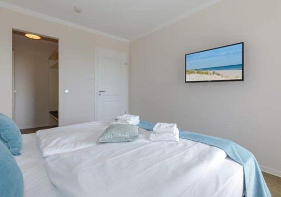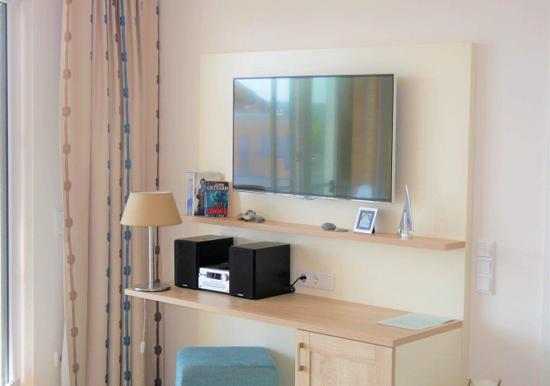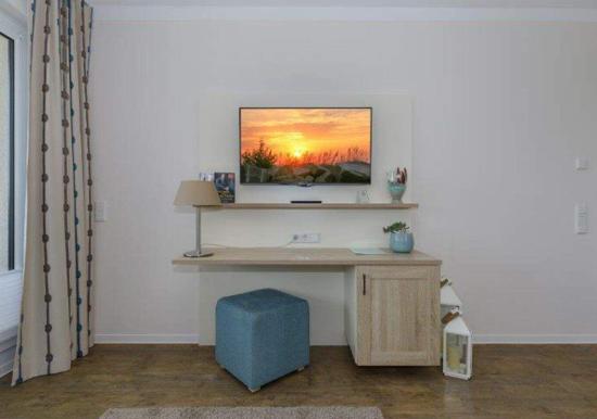 Das Schlafzimmer bietet ein modernes Boxspringbett (1,80m x 2,10m), auf welchem Sie süße Träume haben werden. Auch im Schlafzimmer gibt es einen Flatscreen-TV zu Ihrem Entertainment. Ein Kinderbett sowie ein Hochstuhl können auf Anfrage hinzugebucht werden.