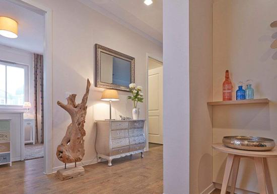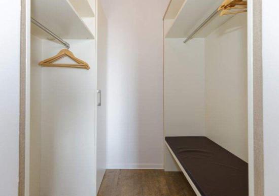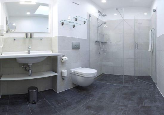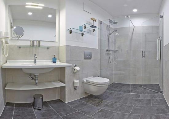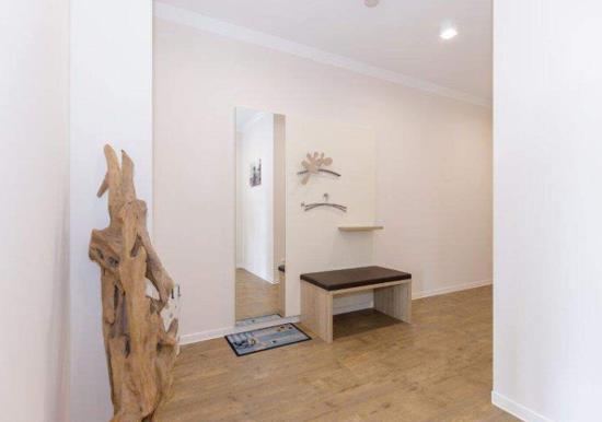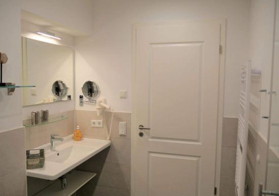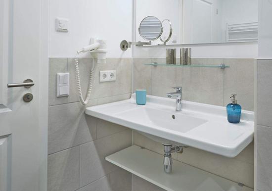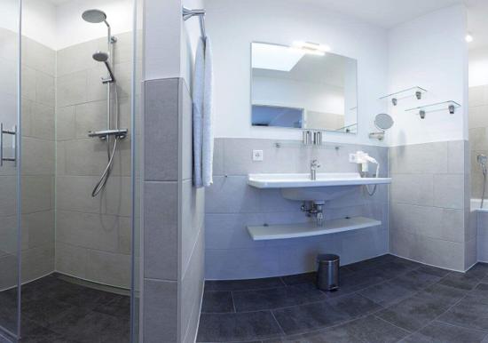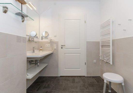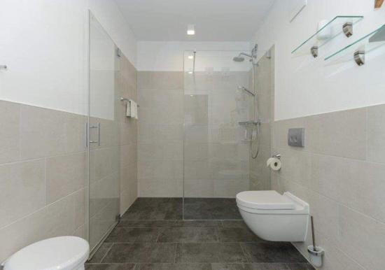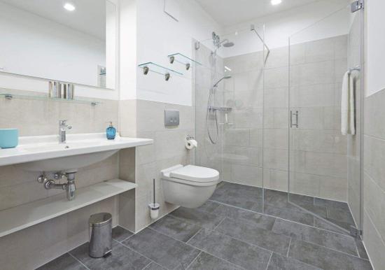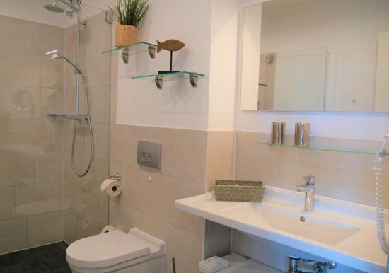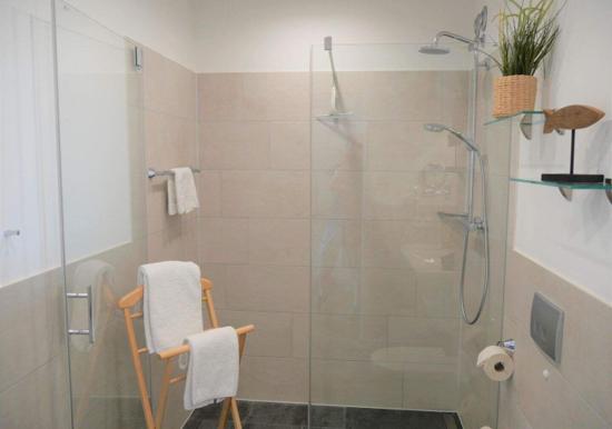 Die offene Regendusche ist das Highlight der Wohnung. Das Badezimmer ist ausgestattet mit einem Handtuchwärmer, einem Waschtisch mit Kosmetikspiegel und einem Haartrockner.