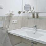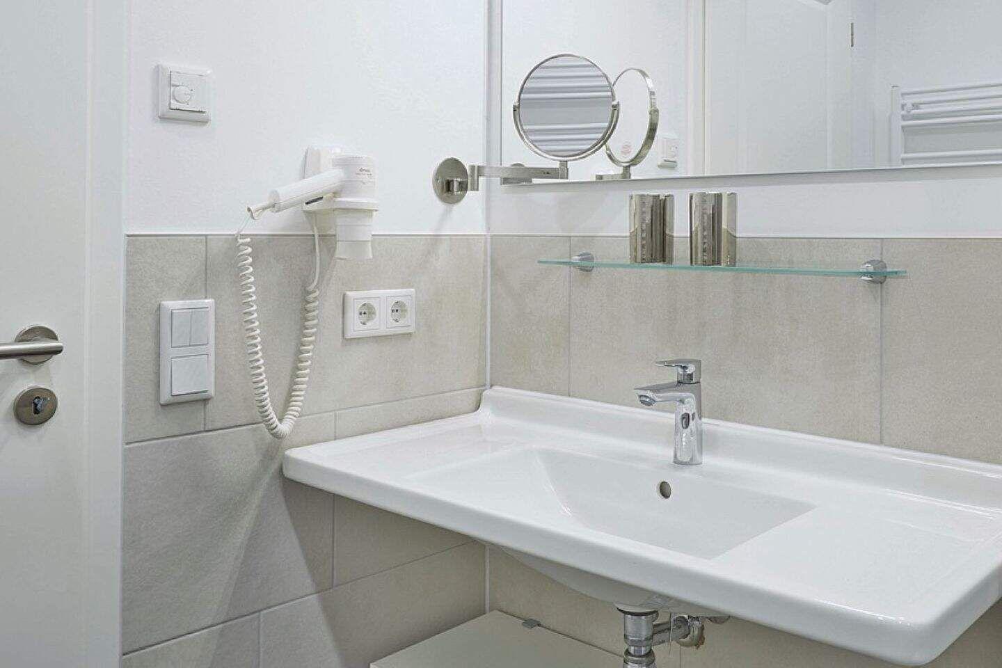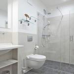 Die offene Regendusche ist das Highlight der Wohnung. Das Badezimmer ist ausgestattet mit einem Handtuchwärmer, einem Waschtisch mit Kosmetikspiegel und einem Haartrockner.