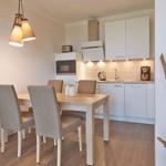 Die offene Küche mit integriertem Essbereich besitzt einen Geschirrspüler, Gefrierfach, Toaster, Kaffeemaschine, Mikrowelle, 2-Platten-Ceranfeld und Wasserkocher.
