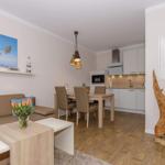 Im kombinierten Wohn-Essbereich befindet sich eine voll ausgestattete Küchenzeile, bequeme Sitzmöbel, ein Esstisch, eine Schlafcouch (140cm x 200cm) sowie ein Flat Screen-TV.