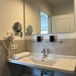 Im geräumigen Bad befinden sich eine großzügige, ebenerdige Regendusche, ein Handtuchtrockner, ein Waschtisch mit Föhn und Kosmetikspiegel.