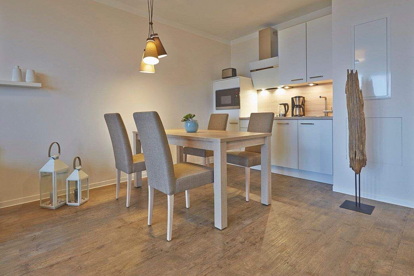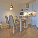 Die offene Küche mit integriertem Essbereich besitzt einen Geschirrspüler, Kühlschrank mit Gefrierfach, Toaster, Kaffeemaschine, Mikrowelle, 2-Platten-Ceranfeld und Wasserkocher.