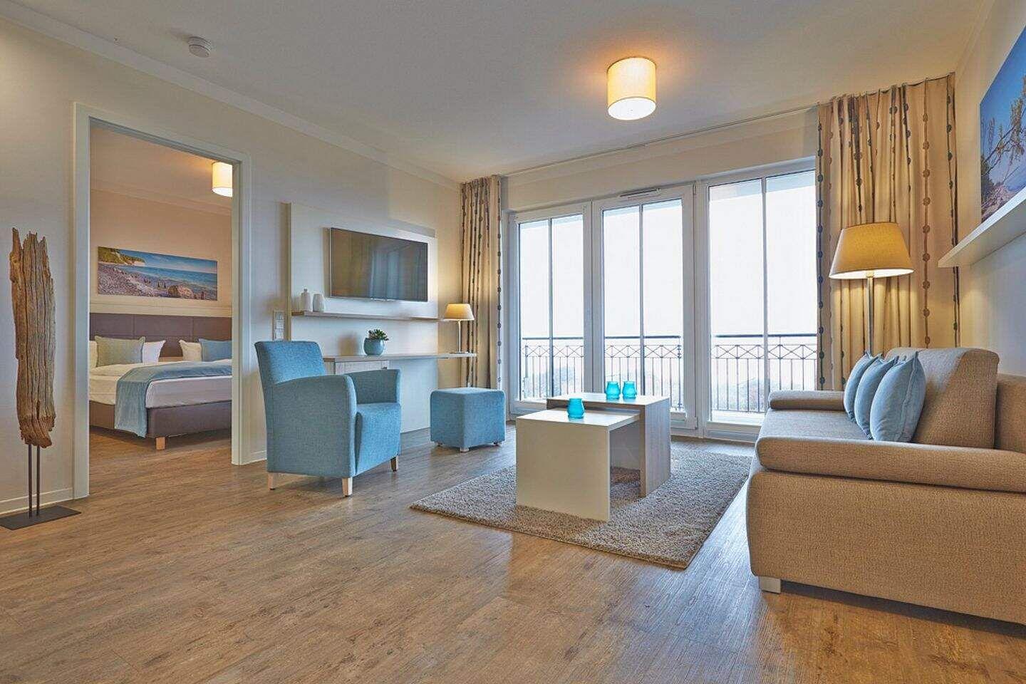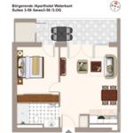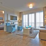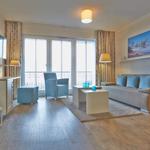 Die exklusive Suite befindet sich im 3. Obergeschoss und bietet auf 49 m² viel Platz für bis zu 4 Personen. Der gemütliche Wohnbereich besitzt ein bequemes Sofa, welches sich mit wenigen Handgriffen zu einer Doppelschlafcouch (1,40m x 2,00m) umfunktionieren lässt, und sorgt mit einem Flatscreen-TV für reichlich Entertainment.