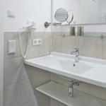 Die offene Regendusche ist das Highlight des Badezimmers. Es ist weiterhin ausgestattet mit einem Handtuchwärmer, einem Waschtisch mit Kosmetikspiegel und einem Haartrockner.