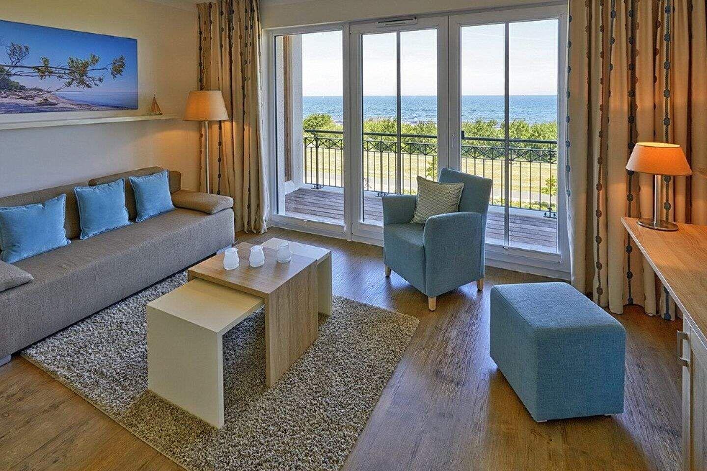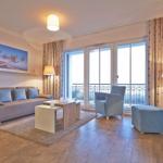 Die lichtdurchflutete Nichtraucher-Suite befindet sich in der 3. Etage und bietet auf 49 m² viel Platz für bis zu 4 Personen. Der gemütliche Wohnbereich besitzt ein bequemes Sofa, welches sich mit wenigen Handgriffen zu einer Doppelschlafcouch (1,40m x 2,00m) umfunktionieren lässt, und sorgt mit einem Flatscreen-TV für reichlich Entertainment.