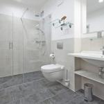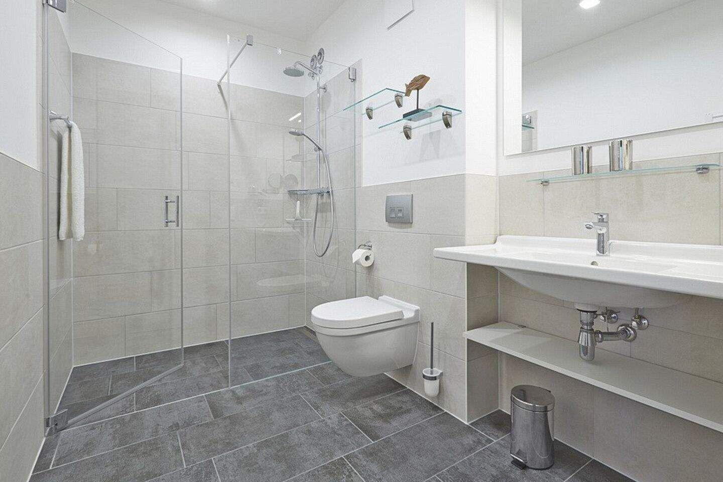 Die offene Regendusche ist das Highlight des Badezimmers. Es ist weiterhin ausgestattet mit einem Handtuchwärmer, einem Waschtisch mit Kosmetikspiegel und einem Haartrockner.