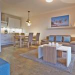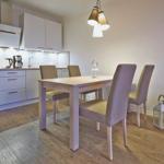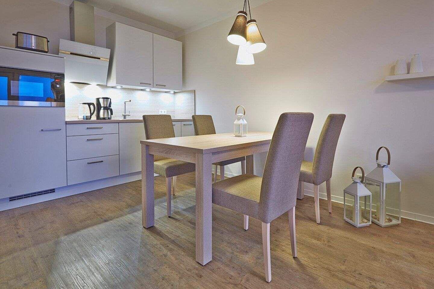 Die offene Küche mit integriertem Essbereich besitzt einen Geschirrspüler, Gefrierfach, Toaster, Kaffeemaschine, Mikrowelle, 2-Platten-Ceranfeld und Wasserkocher.