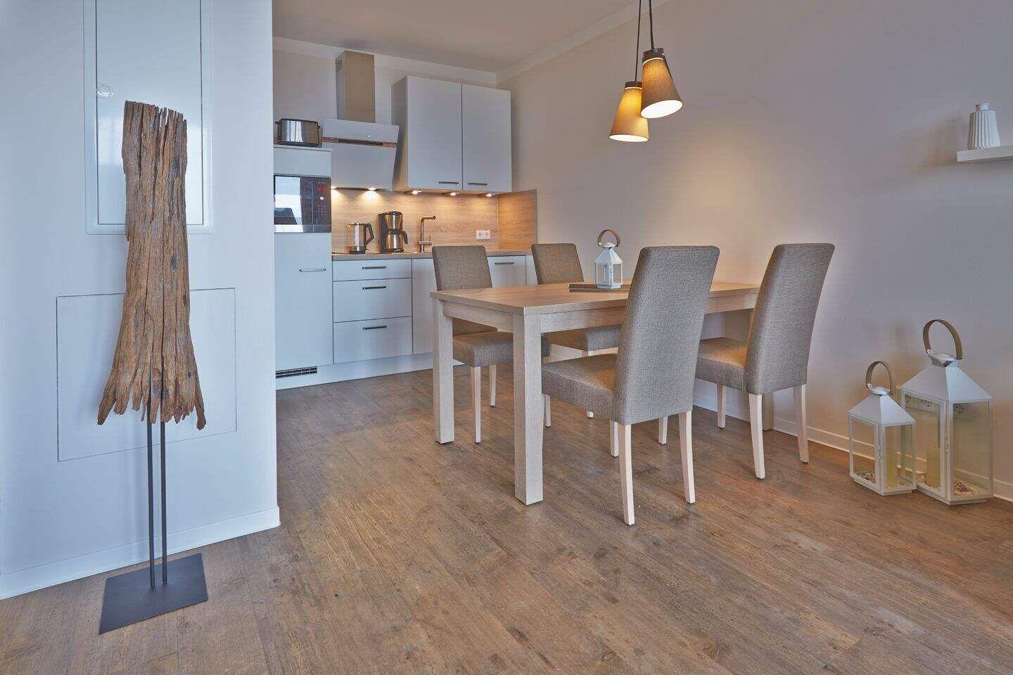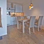 Die offene Küche mit integriertem Essbereich besitzt einen Geschirrspüler, Gefrierfach, Toaster, Kaffeemaschine, Mikrowelle, 2-Platten-Ceranfeld und Wasserkocher.
