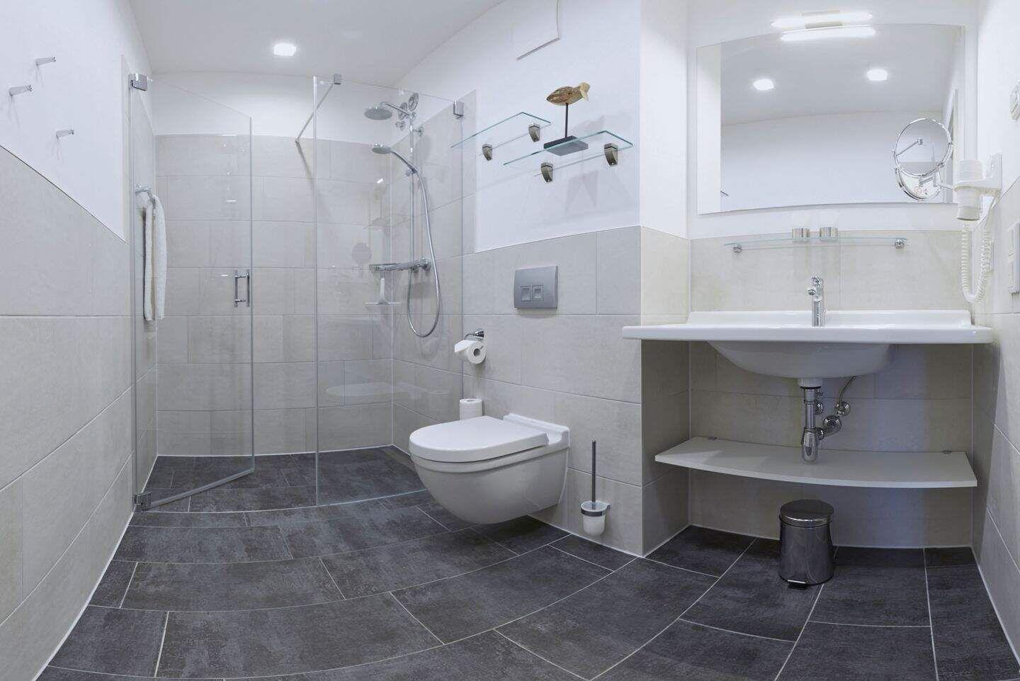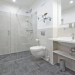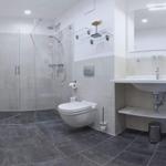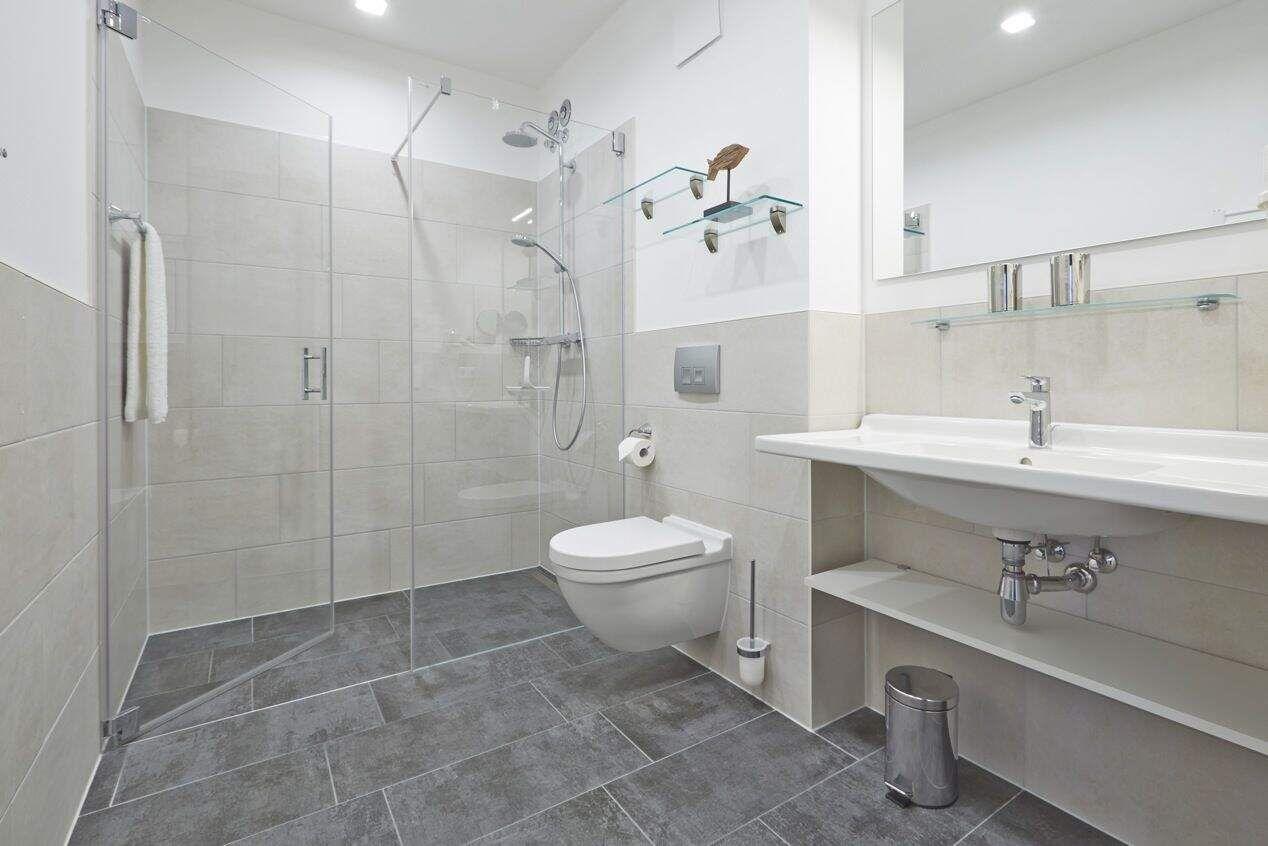 Die offene Regendusche ist das Highlight der Wohnung. Das Badezimmer ist ausgestattet mit einem Handtuchwärmer, einem Waschtisch mit Kosmetikspiegel und einem Haartrockner.