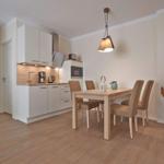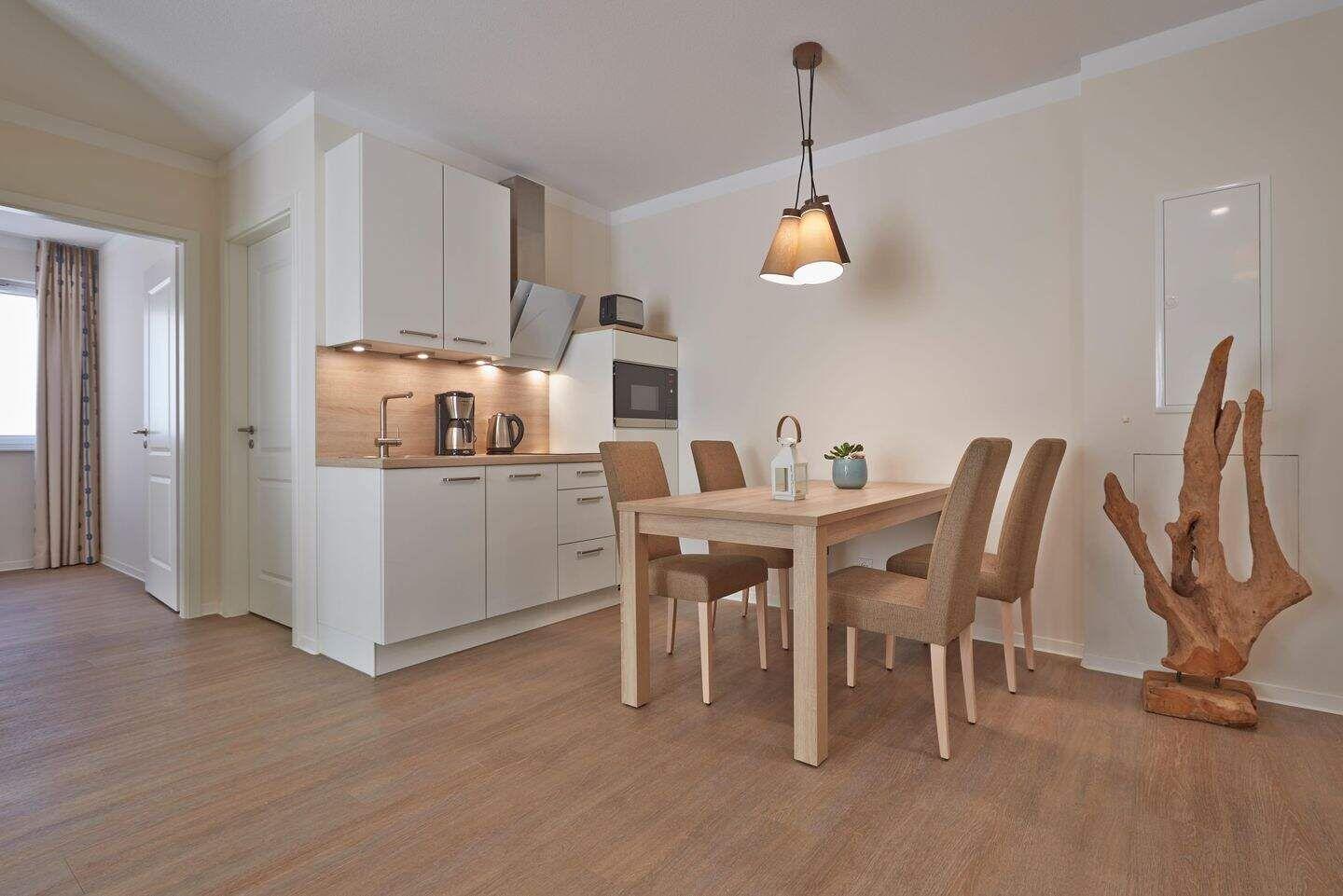 Die offene Küche mit integriertem Essbereich besitzt einen Geschirrspüler, Kühlschrank mit Gefrierfach, Toaster, Kaffeemaschine, Mikrowelle, 2-Platten-Ceranfeld und Wasserkocher.