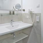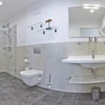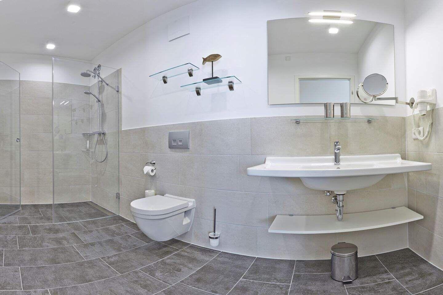 Die offene Regendusche ist das Highlight der Wohnung. Das Badezimmer ist ausgestattet mit einem Handtuchwärmer, einem Waschtisch mit Kosmetikspiegel und einem Haartrockner.