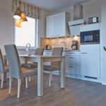 Die an den Wohnbereich angeschlossene Küche mit integriertem Essbereich besitzt einen Geschirrspüler, Gefrierfach, Toaster, Kaffeemaschine, Mikrowelle, 2-Platten-Ceranfeld und Wasserkocher. Am großzügigen Esstisch können Sie gemütlich sitzen, um in den eigenen vier "Urlaubswänden" ihr individuelles Dinner zu genießen oder einfach um ganz in Familie lustige Gesellschaftsspiele zu spielen.