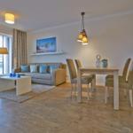 Diese exklusive Ferienwohnung bietet auf 61 m² viel Platz für bis zu 6 Personen. Der gemütliche Wohnbereich besitzt ein bequemes Sofa, welches sich mit wenigen Handgriffen zu einer Doppelschlafcouch (1,50m x 2,00m) umfunktionieren lässt, und sorgt mit einem Flatscreen-TV für reichlich Entertainment.