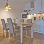 Die offene Küche mit integriertem Essbereich besitzt einen Geschirrspüler, Kühlschrank mit Gefrierfach, Toaster, Kaffeemaschine sowie Nespresso-Kapselmaschine, Backofen und Mikrowelle, 2-Platten-Ceranfeld und Wasserkocher. Am großzügigen Esstisch können Sie gemütlich sitzen, um in den eigenen vier "Urlaubswänden" Ihr individuelles Dinner zu genießen oder einfach um ganz in Familie lustige Gesellschaftsspiele zu spielen.