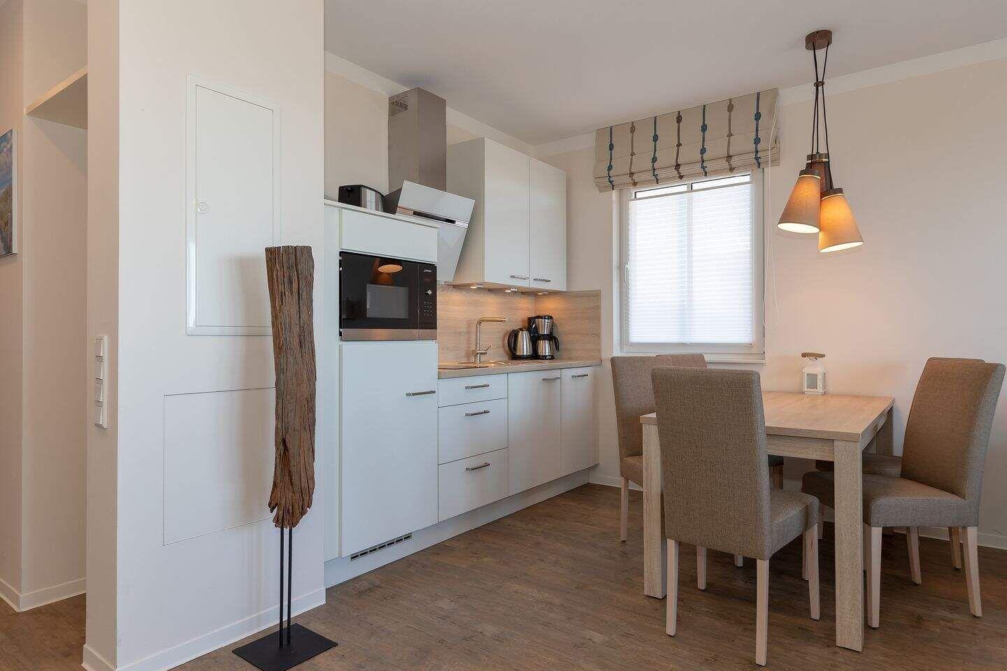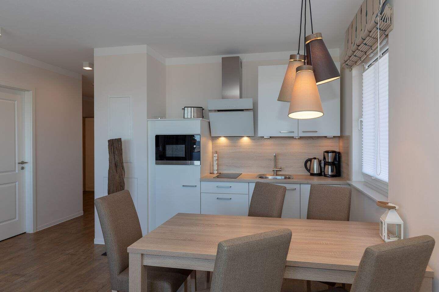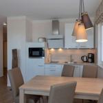 Die offene Küche mit integriertem Essbereich besitzt einen Geschirrspüler, Gefrierfach, Toaster, Kaffeemaschine, Mikrowelle, 2-Platten-Ceranfeld und Wasserkocher. Am großzügigen Esstisch können Sie gemütlich sitzen, um in den eigenen vier "Urlaubswänden" ihr individuelles Dinner zu genießen oder einfach um ganz in Familie lustige Gesellschaftsspiele zu spielen.