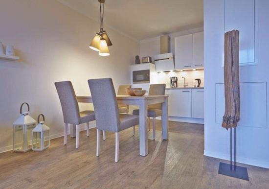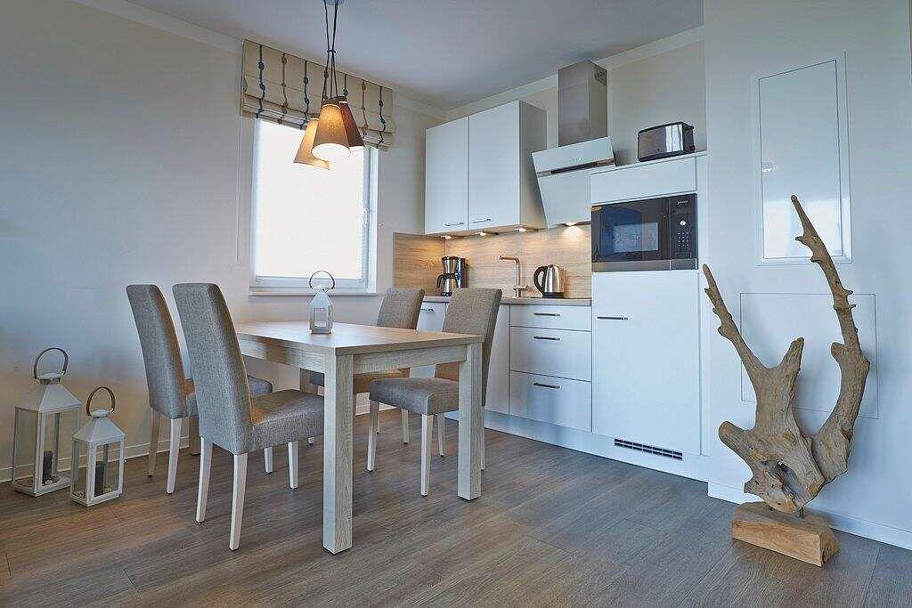 Die offene Küche mit integriertem Essbereich besitzt einen Geschirrspüler, Gefrierfach, Toaster, Kaffeemaschine, Mikrowelle, 2-Platten-Ceranfeld und Wasserkocher. Am großzügigen Esstisch können Sie gemütlich sitzen, um in den eigenen vier "Urlaubswänden" ihr individuelles Dinner zu genießen oder einfach um ganz in Familie lustige Gesellschaftsspiele zu spielen.