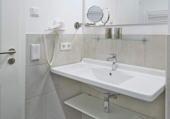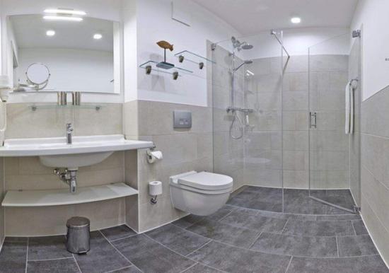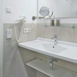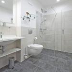 Die offene Regendusche ist das Highlight der Wohnung. Das Badezimmer ist ausgestattet mit einem Handtuchwärmer, einem Waschtisch mit Kosmetikspiegel und einem Haartrockner.