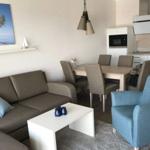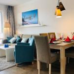 Die lichtdurchflutete Suite befindet sich im dritten Obergeschoss des Aparthotels und bietet auf 62 m² viel Platz für bis zu 5 Personen. Der moderne Wohnbereich besitzt ein bequemes Sofa, welches sich mit wenigen Handgriffen zu einer Doppelschlafcouch (1,50m x 2,00m) umfunktionieren lässt, und sorgt mit einem Flatscreen-TV für reichlich Entertainment.