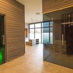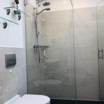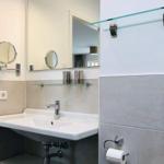 Die offene Regendusche ist das Highlight der Wohnung. Das Badezimmer ist ausgestattet mit einem Handtuchwärmer, einem Waschtisch mit Kosmetikspiegel und einem Haartrockner.