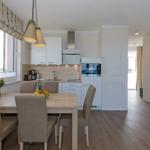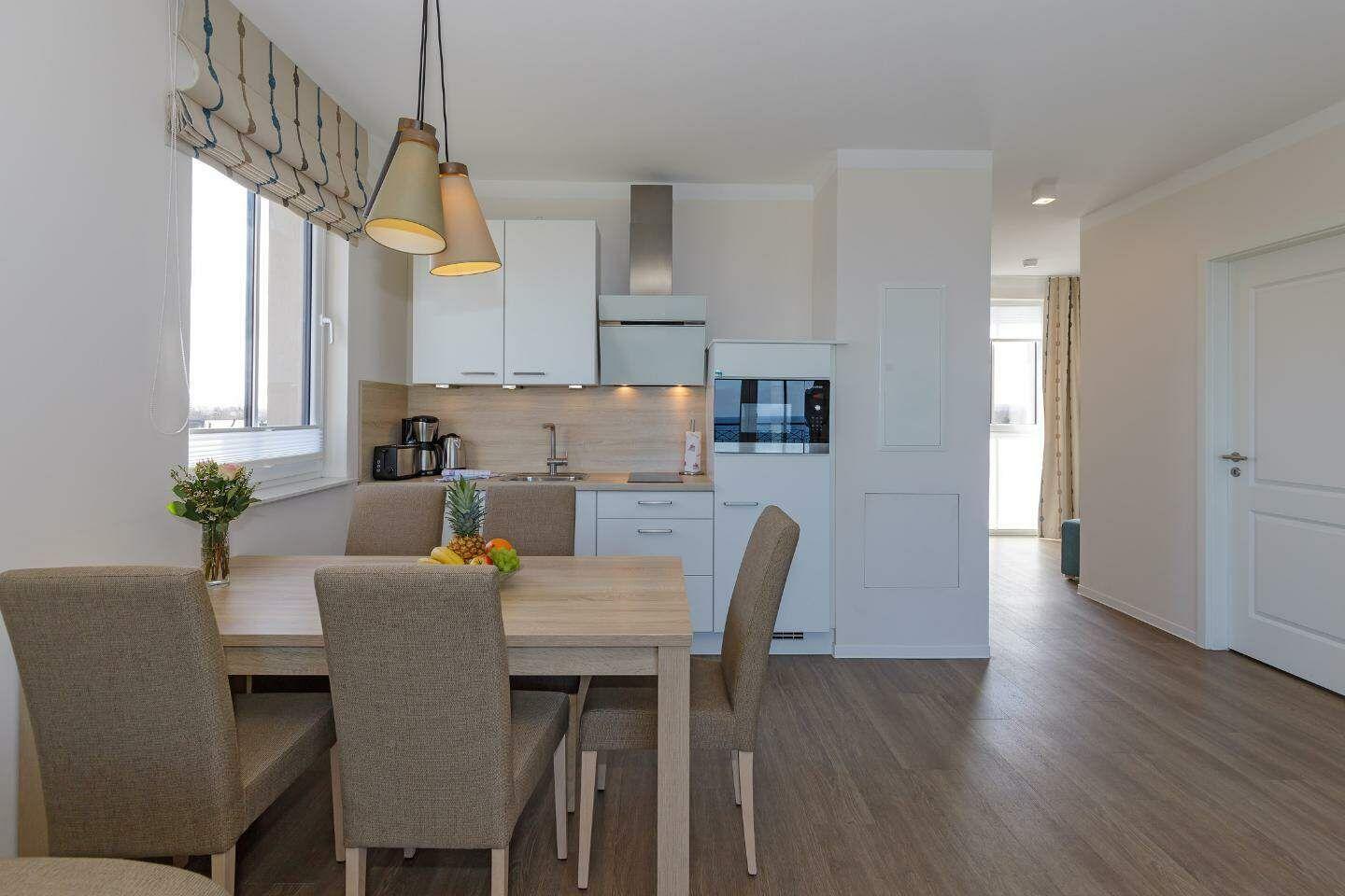 Die offene Küche mit integriertem Essbereich besitzt einen Geschirrspüler, Gefrierfach, Toaster, Kaffeemaschine, Mikrowelle, 2-Platten-Ceranfeld und Wasserkocher.