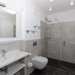 Die offene Regendusche ist das Highlight der Wohnung. Das Badezimmer ist ausgestattet mit einem Handtuchwärmer, einem Waschtisch mit Kosmetikspiegel und einem Haartrockner.