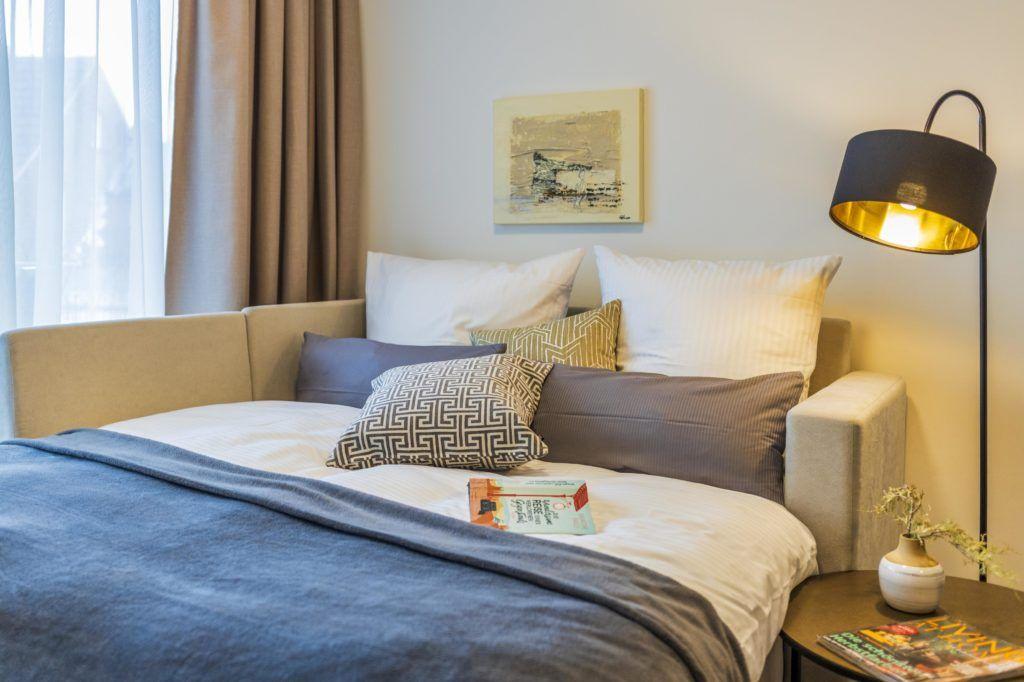 Die Ferienwohnung bietet eine komfortable Gestaltung, die ideale Voraussetzungen für einen erholsamen Aufenthalt schafft. Sie verfügt über ein helles Schlafzimmer mit zwei Doppelbetten, die ausreichend Platz für bis zu vier Personen bieten. Die modern ausgestattete Küchenzeile lädt mit einem Elektro-/Gasherd, Backofen, Mikrowelle und Geschirrspüler zum Kochen ein. Geschirr und Besteck sind ebenfalls vorhanden, wodurch die Selbstverpflegung unkompliziert möglich ist.