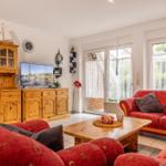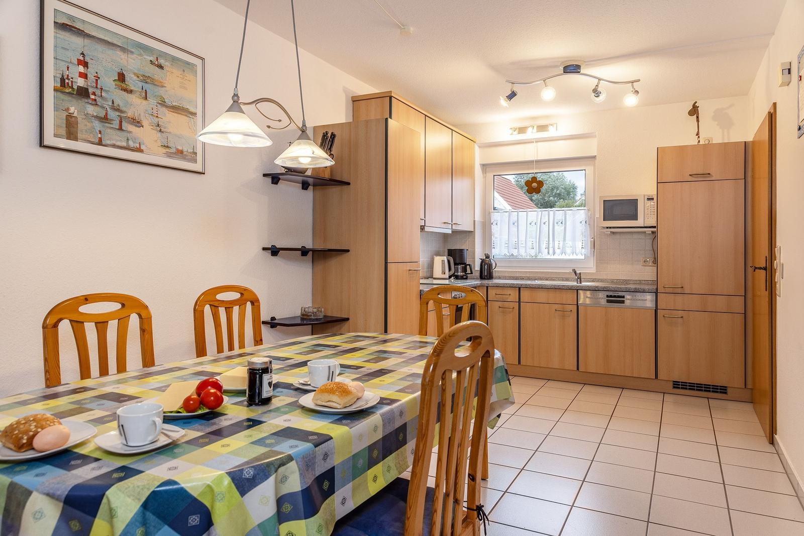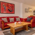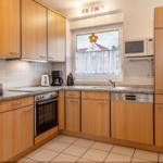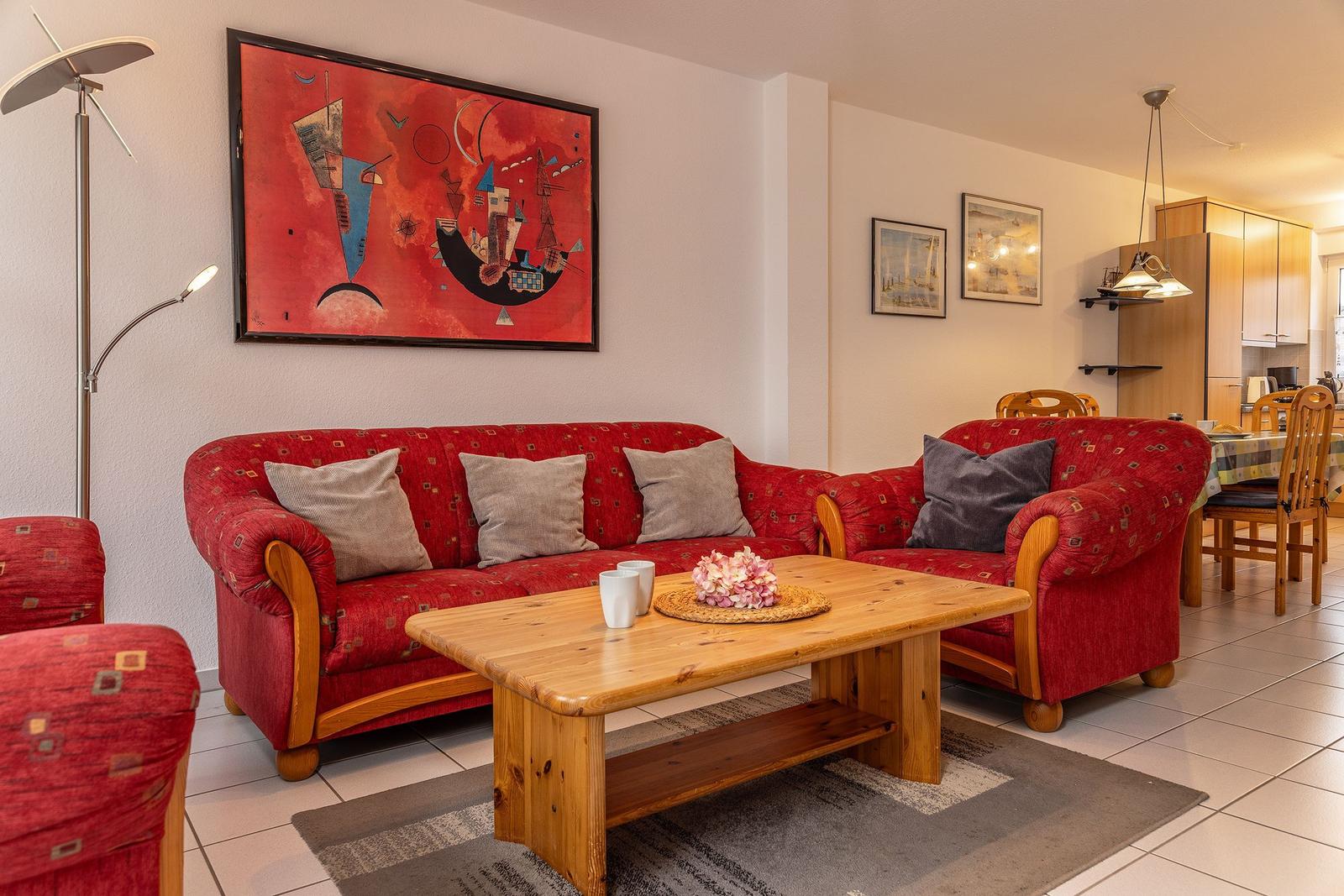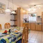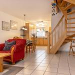 Die Ferienwohnung bietet eine großzügige und helle Gestaltung mit einem einladenden Wohn-/Essbereich, ausgestattet mit einem 3er Sofa, einem 2er Sofa, einem Sessel und einem Flachbildfernseher. Der offene Küchenbereich verfügt über moderne Geräte, darunter einen Kühlschrank mit Gefriermöglichkeit, einen Geschirrspüler, einen Elektro-/Gasherd mit Backofen sowie eine Mikrowelle – ideal für gemütliche Kochabende. Für Familien steht ein Kinderhochstuhl bereit.