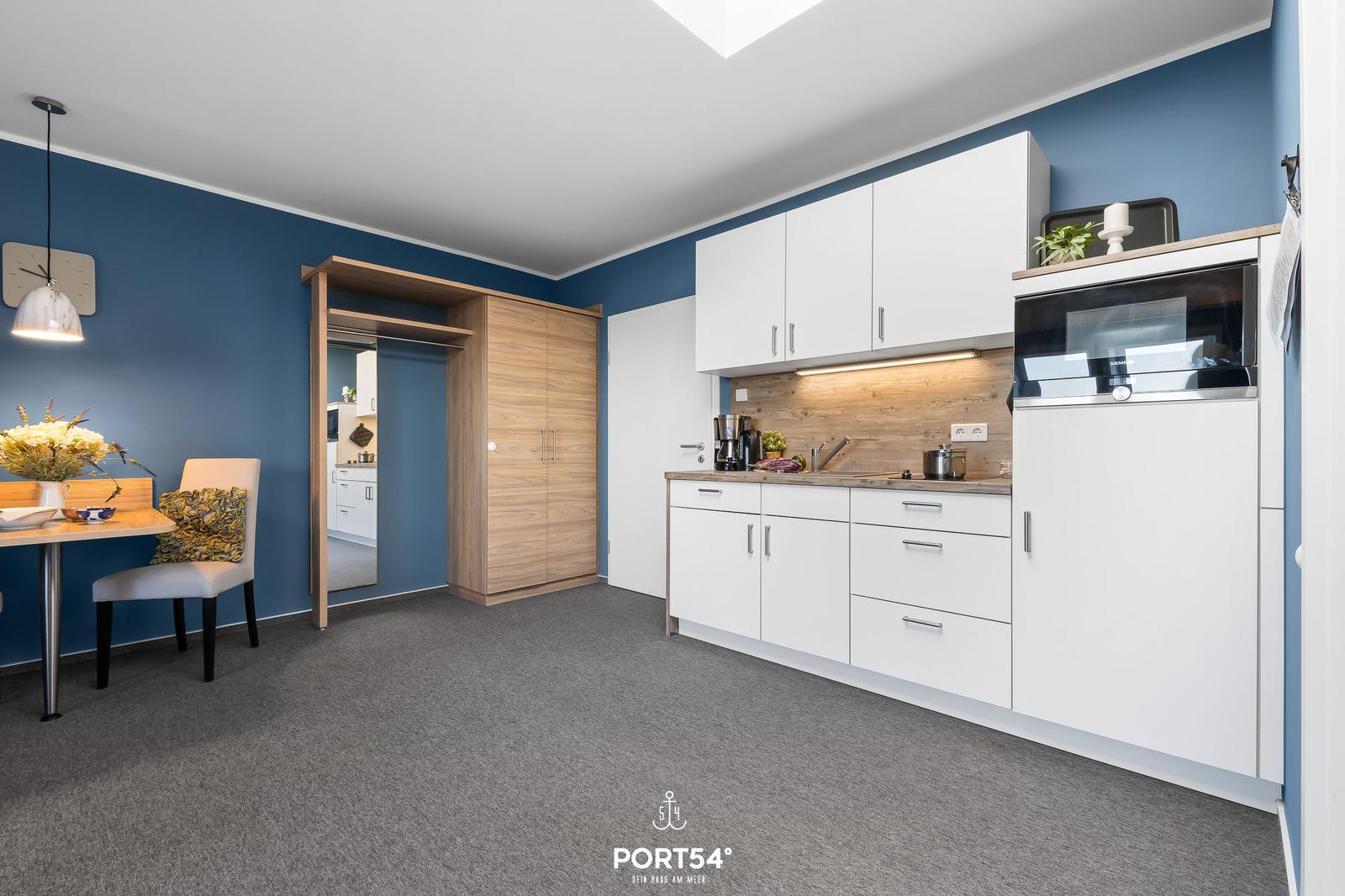Zusätzlich steht ein voll ausgestatteter Küchenbereich zur Verfügung, der alle Notwendigkeiten für die Zubereitung eigener Mahlzeiten bietet.