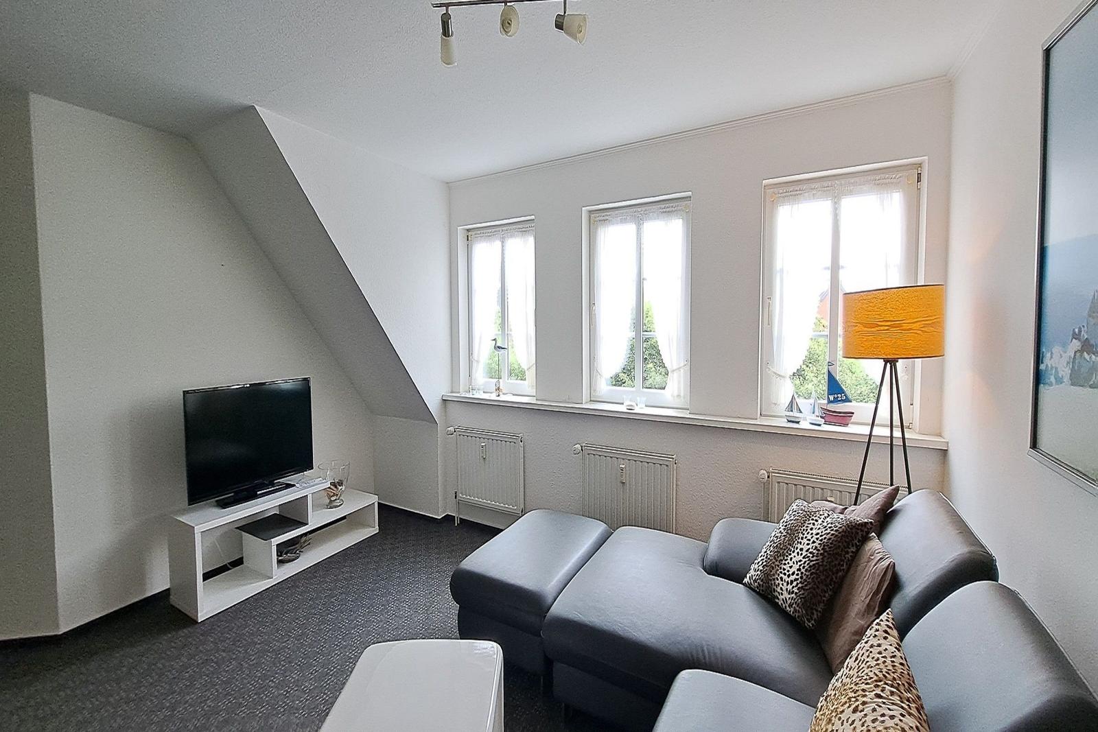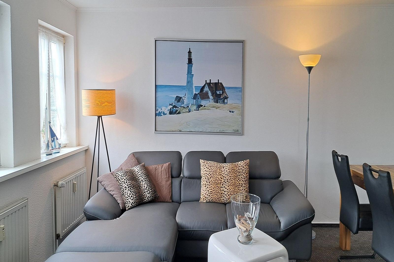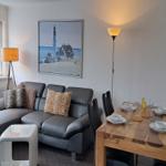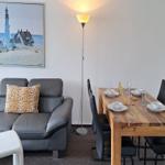Die Ferienwohnung besteht aus zwei gemütlichen Schlafzimmern, einem hellen Wohnzimmer und einem modernen Badezimmer. Der offene Küchenbereich ist mit allem ausgestattet, was Sie für die Zubereitung Ihrer Lieblingsgerichte benötigen. Neben modernen Elektrogeräten wie Herd, Backofen, Spülmaschine und Kühlschrank stehen Ihnen Kaffeemaschine, Toaster und Wasserkocher zur Verfügung. Sollte es einmal regnerisch sein, lädt die Sofaecke im Wohnzimmer dazu ein, sich zurückzulehnen und einen Film auf dem Fernseher zu genießen.