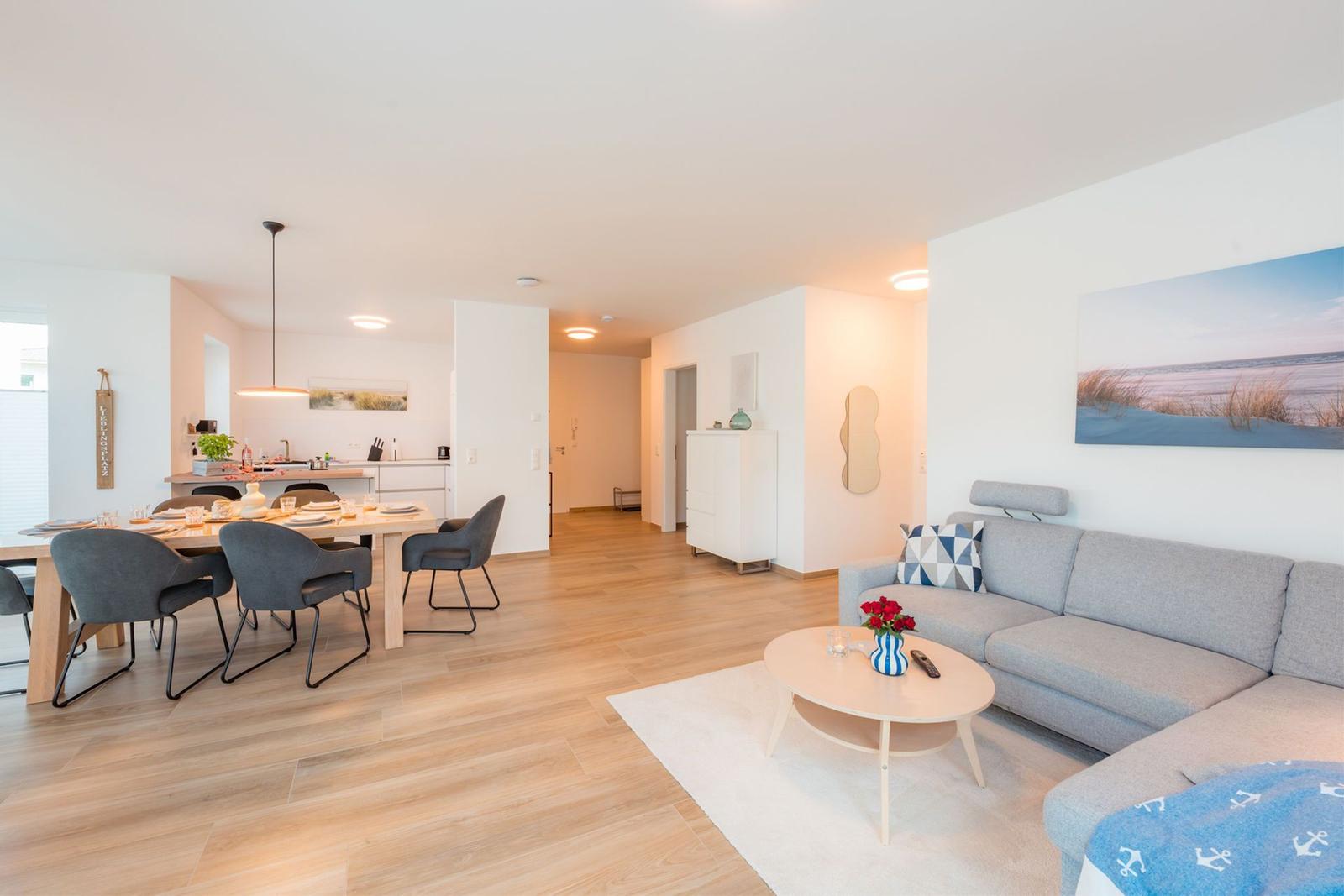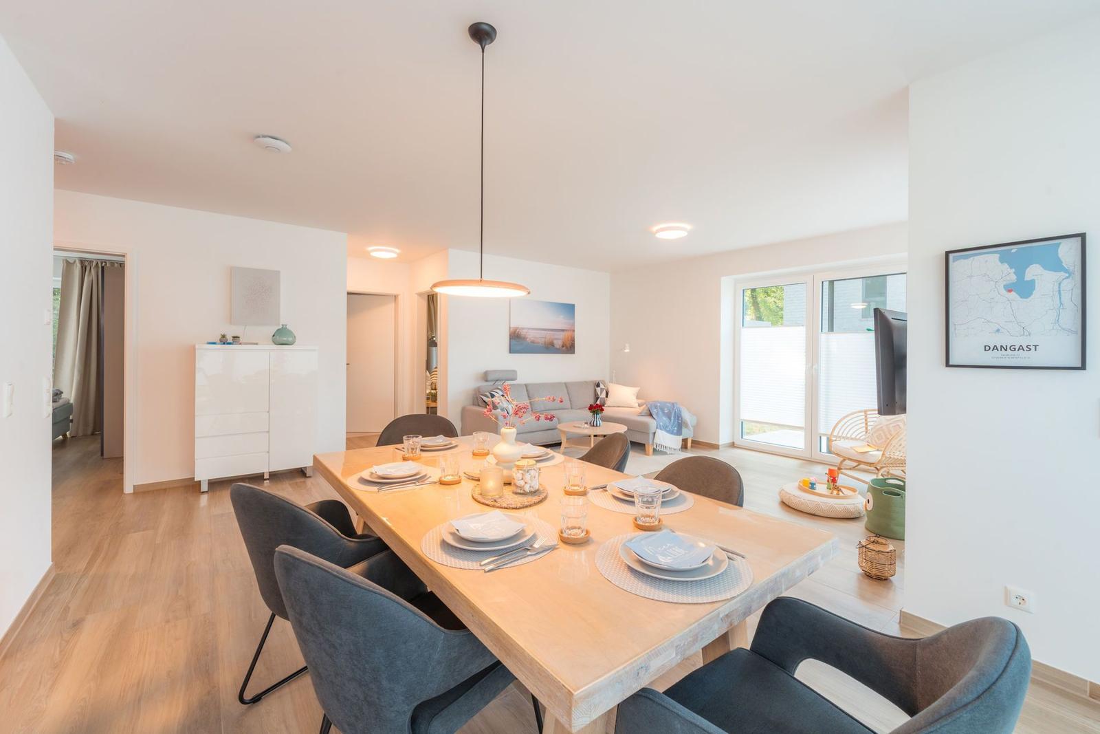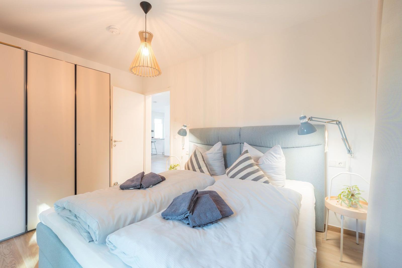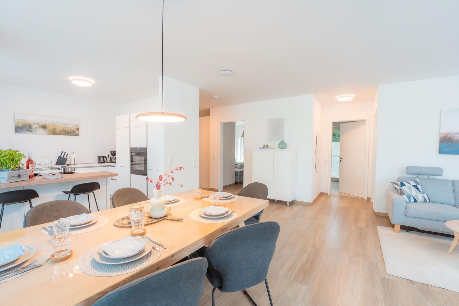 Die Ferienwohnung bietet modernen Komfort in einem barrierefreien Ambiente. Mit zwei gemütlichen Schlafzimmern, die jeweils mit einem Doppelbett ausgestattet sind, bietet sie ausreichend Platz für Familien und Gruppen. Die offene Küche ist vollständig ausgestattet mit einem Elektro-/Gasherd, Backofen, Mikrowelle und Kühlschrank, ergänzt durch eine Kaffeemaschine, Toaster und Gefriermöglichkeit. Der Esstisch lädt zu gemeinsamen Mahlzeiten ein. Das Badezimmer verfügt über eine bodengleiche Dusche und ist mit einem Fenster für optimale Belüftung ausgestattet. Zusätzliche Annehmlichkeiten wie WLAN, eine HiFi-Anlage und ein Fernseher sorgen für Unterhaltung. Für Allergiker geeignet, ist die Wohnung mit Fußbodenheizung und Fliegengittern ausgestattet. Ein Parkplatz steht zur Verfügung, und für Familien gibt es einen Kinderhochstuhl sowie Spielzeug. Waschmaschine und Bügeleisen runden das Angebot ab, um den Aufenthalt so komfortabel wie möglich zu gestalten.
