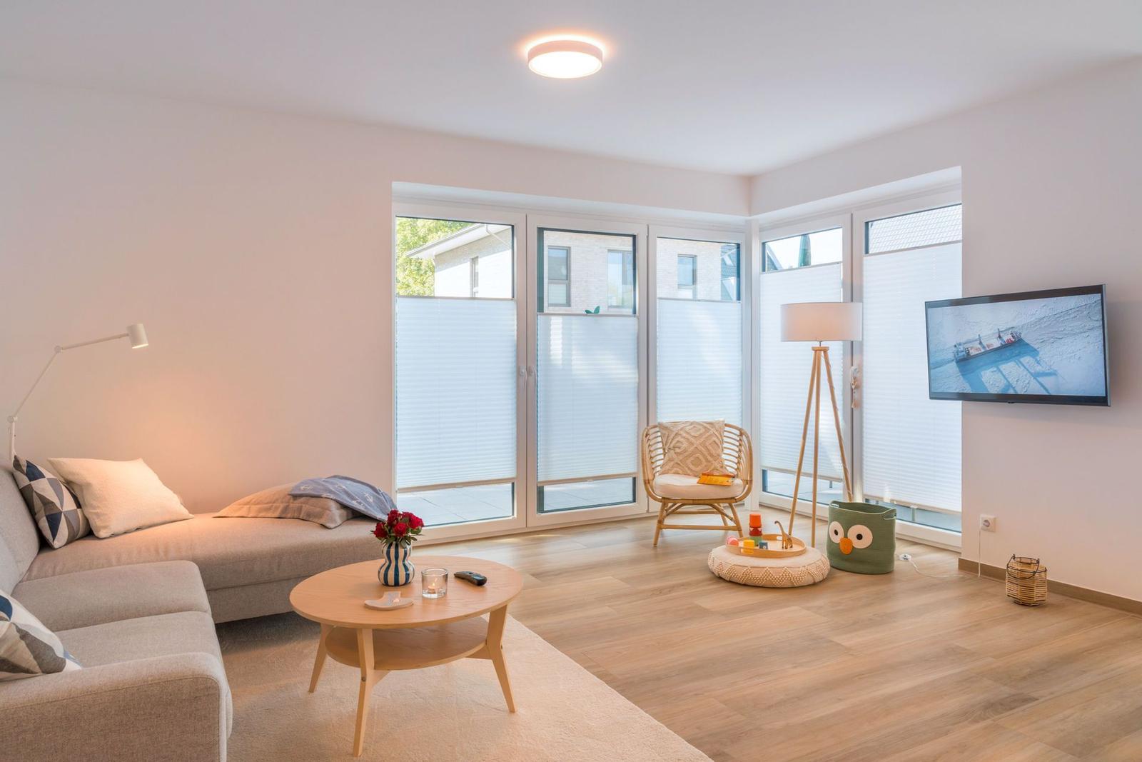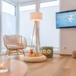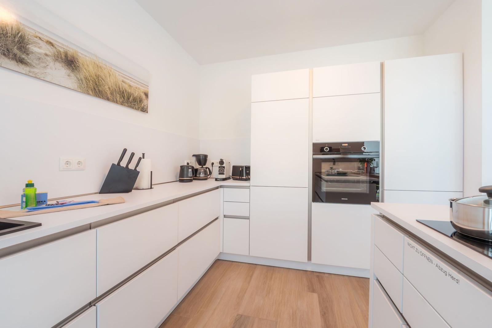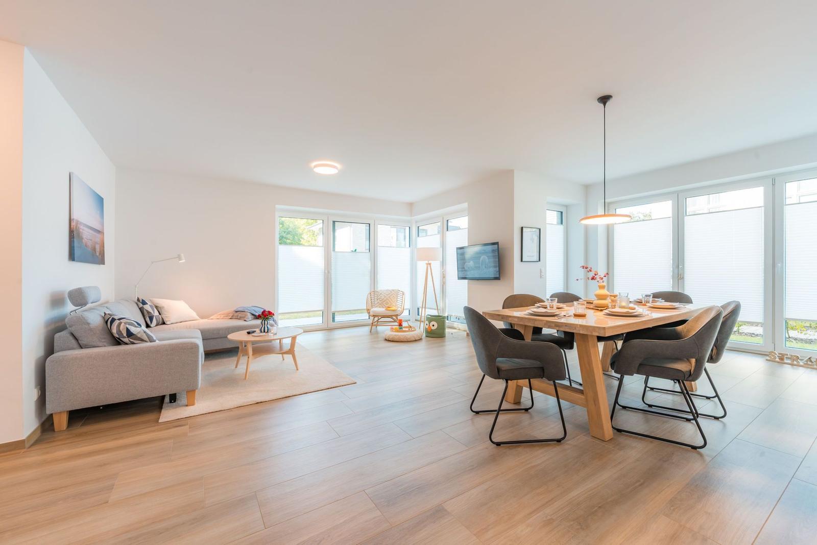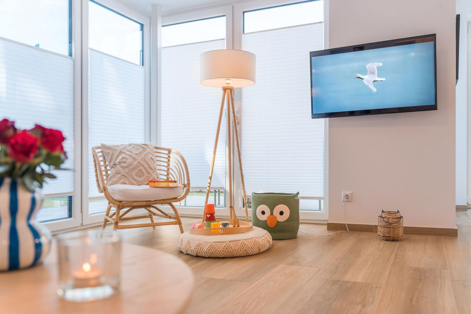 Die Ferienwohnung bietet modernen Komfort in einem barrierefreien Ambiente. Mit zwei gemütlichen Schlafzimmern, die jeweils mit einem Doppelbett ausgestattet sind, bietet sie ausreichend Platz für Familien und Gruppen. Die offene Küche ist vollständig ausgestattet mit einem Elektro-/Gasherd, Backofen, Mikrowelle und Kühlschrank, ergänzt durch eine Kaffeemaschine, Toaster und Gefriermöglichkeit. Der Esstisch lädt zu gemeinsamen Mahlzeiten ein. Das Badezimmer verfügt über eine bodengleiche Dusche und ist mit einem Fenster für optimale Belüftung ausgestattet. Zusätzliche Annehmlichkeiten wie WLAN, eine HiFi-Anlage und ein Fernseher sorgen für Unterhaltung. Für Allergiker geeignet, ist die Wohnung mit Fußbodenheizung und Fliegengittern ausgestattet. Ein Parkplatz steht zur Verfügung, und für Familien gibt es einen Kinderhochstuhl sowie Spielzeug. Waschmaschine und Bügeleisen runden das Angebot ab, um den Aufenthalt so komfortabel wie möglich zu gestalten.