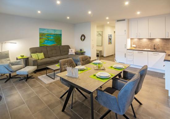 Die Ferienwohnung bietet einen komfortablen Aufenthalt mit durchdachten Raumkonzepten und hochwertiger Ausstattung. Sie verfügt über zwei Schlafzimmer, eines mit einem Doppelbett und eines mit zwei Einzelbetten, ideal für Familien oder kleine Gruppen. Die offen gestaltete Küche ist mit modernen Geräten ausgestattet, darunter ein Geschirrspüler, Elektro-/Gasherd, Backofen, Mikrowelle und Kühlschrank, sowie eine Kaffeemaschine und ein Toaster. Ein Kind hochstuhl ist ebenfalls vorhanden.