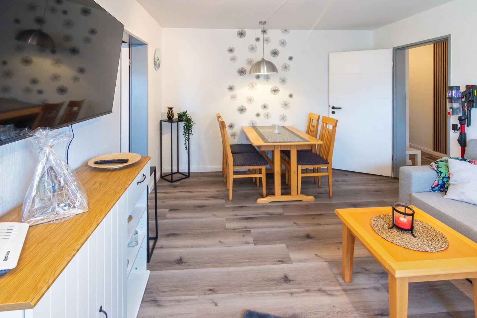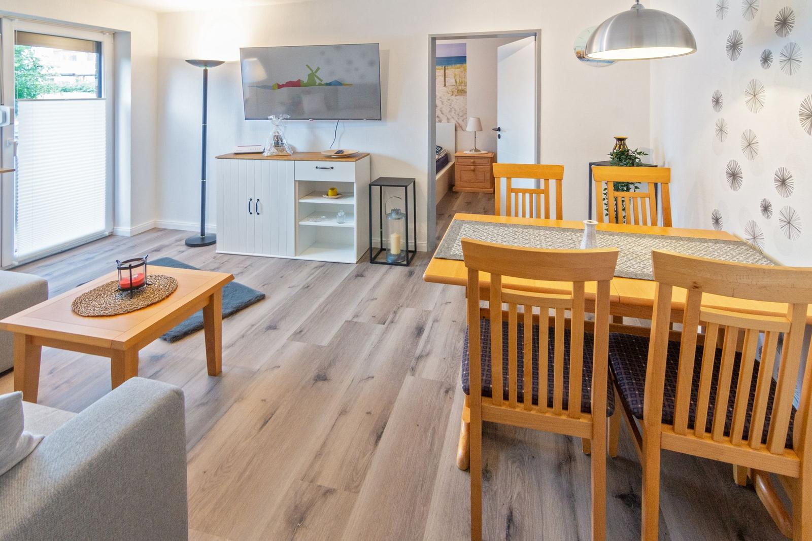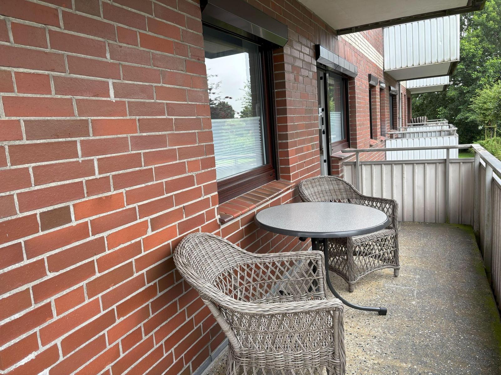 Die Ferienwohnung Küstenglück in Dornumersiel bietet einen einladenden Außenbereich, der zur Erholung und Entspannung einlädt. Ein möblierter Balkon ermöglicht es, die frische Nordseeluft zu genießen, sei es bei einer Tasse Kaffee am Morgen oder einem Glas Wein am Abend. Die Wohnung befindet sich in der 1. Etage und bietet damit eine angenehme Aussicht. Für weitere Aktivitäten steht ein gemeinschaftlicher Abstellraum für Fahrräder zur Verfügung, ideal für die Erkundung der Umgebung. Zudem gehört ein eigener PKW-Stellplatz zur Unterkunft, was die Anreise erleichtert. Die zentrale und ruhige Lage bietet eine perfekte Grundlage für einen erholsamen Urlaub an der Nordsee, ab dem Jahr 2025 modernisiert, ist Küstenglück die ideale Wahl für einen entspannten Aufenthalt.