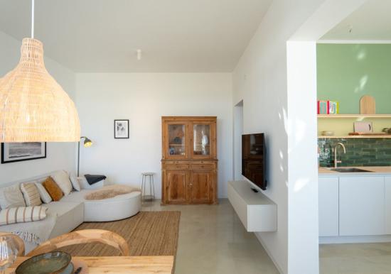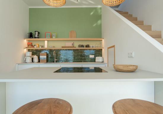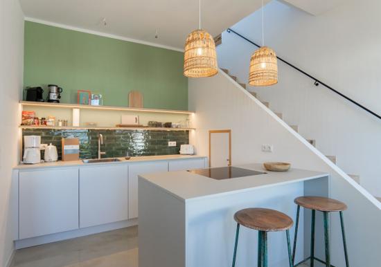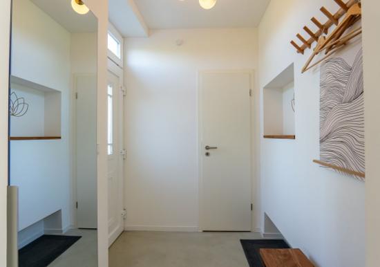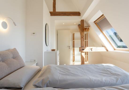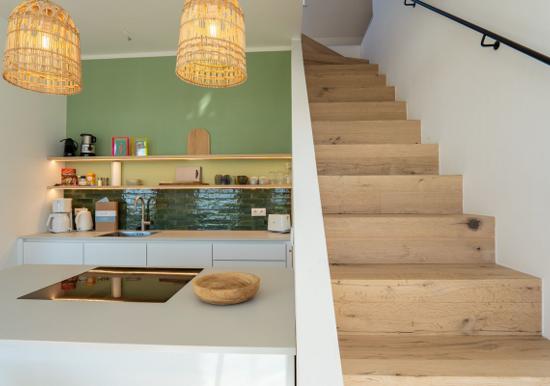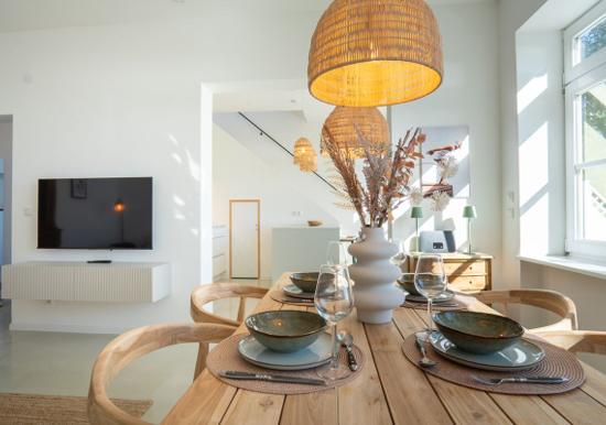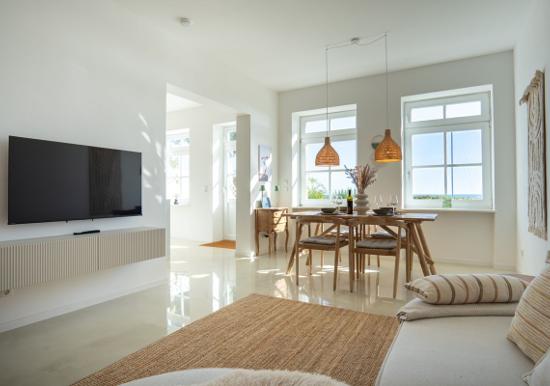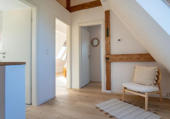 Urlauben Sie auf großzügigen 70 m² (1. Etage & Dachgeschoss) im "Haus an der Mole". Das große Wohn-Esszimmer ist mit einer gemütlichen Sofaecke und TV ausgestattet. Im Essbereich finden bequem drei Personen Platz. Der angrenzende Küchenbereich ist, für den Urlaubsbedarf, voll ausgestattet. Ein Backofen und ein Geschirrspüler gehören ebenso dazu, wie die Kaffeemaschine, der Wasserkocher und ein Toaster. Geschirr und Besteck sind ausreichend vorhanden. Auf der gleichen Etage befindet sich das kleinere Schlafzimmer mit einem Einzelbett. Das größere Schlafzimmer verfügt über ein komfortables Doppelbett und einen großen Kleiderschrank. Wie das Tageslichtbad mit Dusche und Badewanne, befindet sich das große Schlafzimmer im Dachgeschoss.
