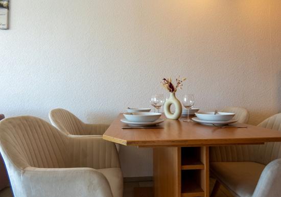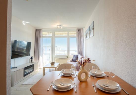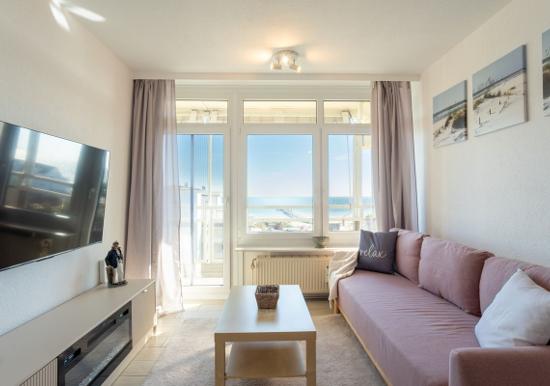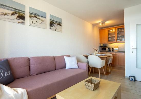 Der lichtdurchflutete Wohnbereich ist mit einer gemütlichen Sofaecke (Schlafsofa), einem Flatscreen-TV und Bluray-Player ausgestattet. Die vorhandene Musikanlage verfügt über Blutooth.