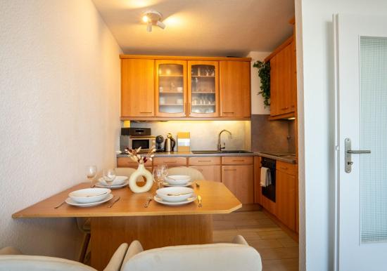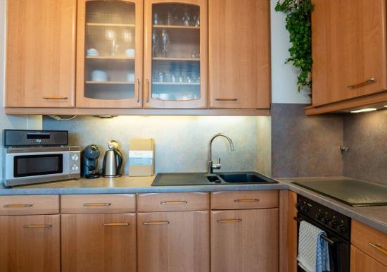 Die Küche ist mit allem, was man im Urlaub braucht, ausgestattet. Außerdem steht Ihnen noch ein Backofen zur Verfügung. Und für die Angelfans unter Ihnen: das Gefriefach fasst 40 Liter.