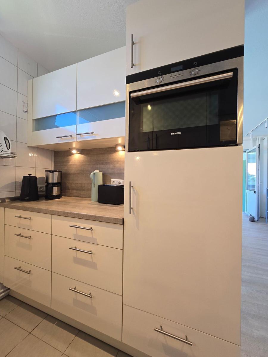Die offene Küche ist mit hochwertigen Geräten ausgestattet, darunter ein Geschirrspüler, Elektro-/Gasherd, Backofen, Mikrowelle, Kühlschrank, Kaffeemaschine, Toaster und sogar eine Gefriermöglichkeit. Ein Esstisch ermöglicht gesellige Mahlzeiten.