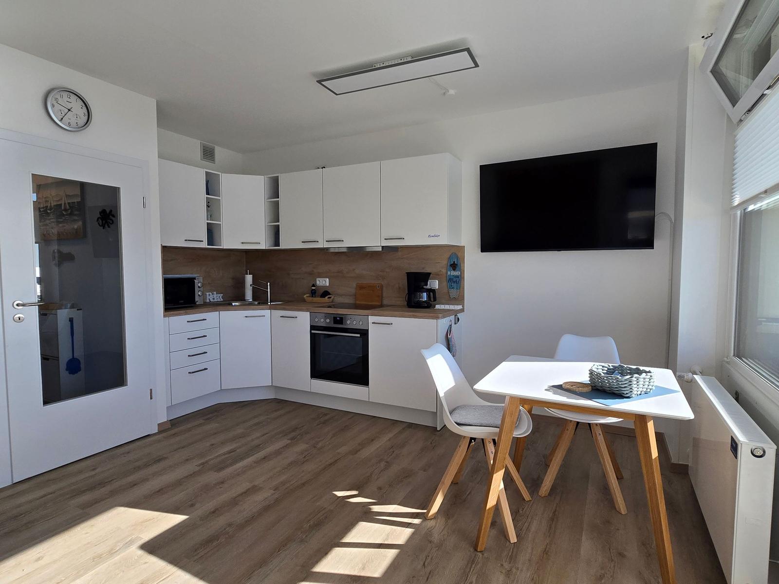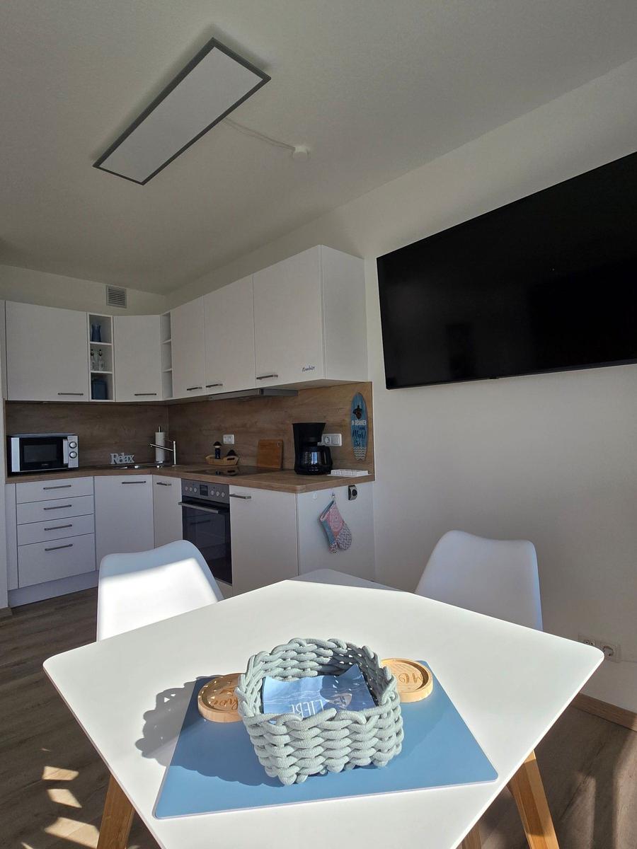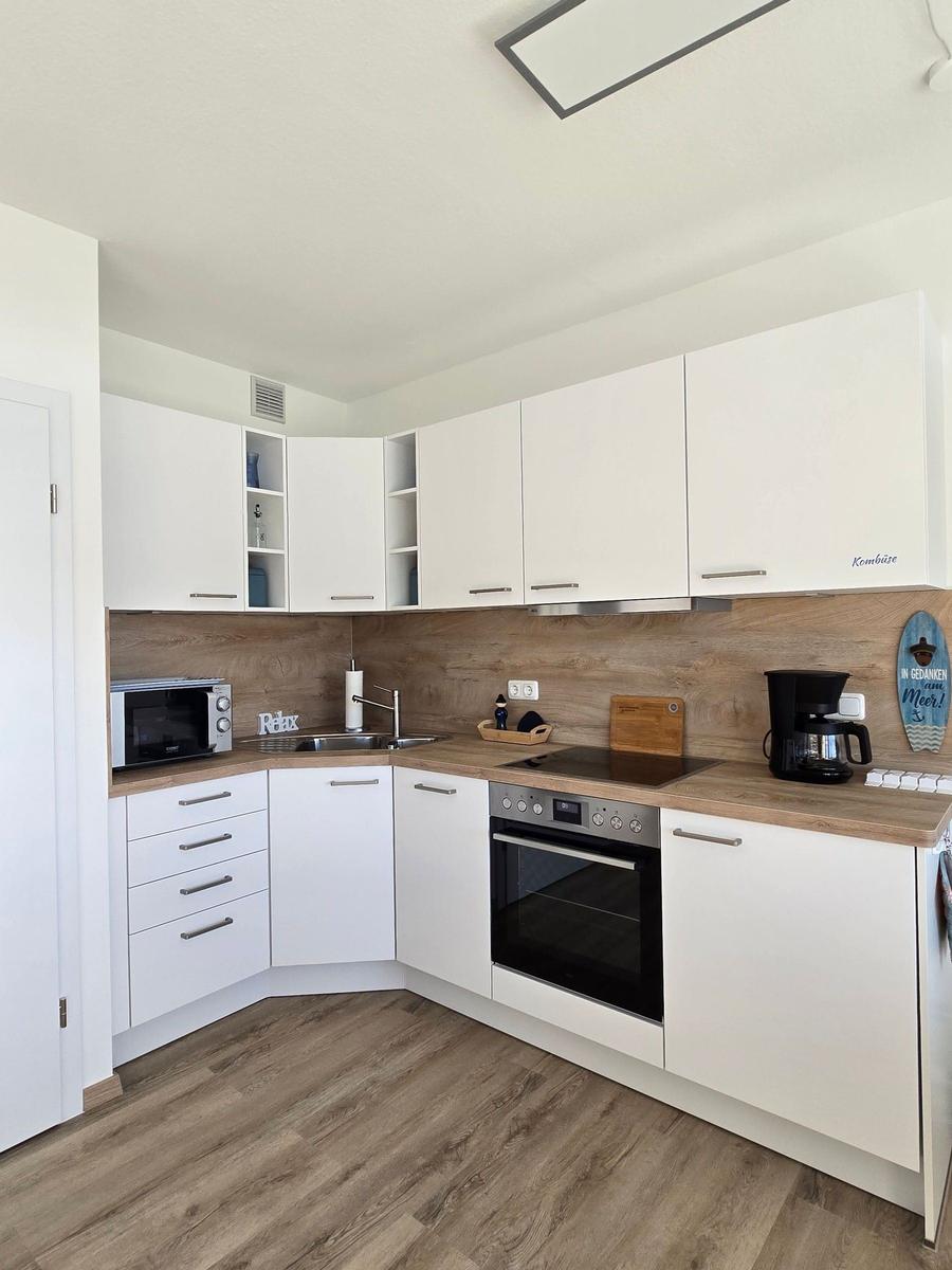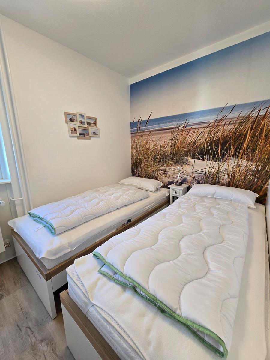 Die Ferienwohnung "Strandglück 2-45" im Vier Jahreszeiten bietet auf 36 m² Wohnfläche eine moderne und komfortable Unterkunft für bis zu zwei Gäste. Der separate Wohn-Essbereich mit offener Küche ist hochwertig ausgestattet: ein Induktionsherd, Backofen, Mikrowelle, Spülmaschine, Kühlschrank mit Gefrierfach, Wasserkocher, Toaster und Kaffeemaschine stehen zur Verfügung. Ein gemütlicher Esstisch, sowie ein Sofa und ein bequemer Sessel sorgen für entspannte Stunden. Das separate Schlafzimmer ist mit zwei Einzelbetten (0,90 m x 2,00 m) ausgestattet. Das neuwertige Badezimmer verfügt über eine Dusche mit Wanne. WLAN, Staubsauger und die notwendige Kücheninventar sind ebenfalls vorhanden. Praktisch sind die gemeinschaftlich nutzbaren Waschmaschine und der Trockner im Haus. Ein Aufzug ermöglicht einfachen Zugang zur Wohnung, und ein kostenloser Privatparkplatz ist ebenfalls vorhanden. Die Nichtraucherwohnung bietet Sichtschutz an allen Fenstern für ungestörte Momente.