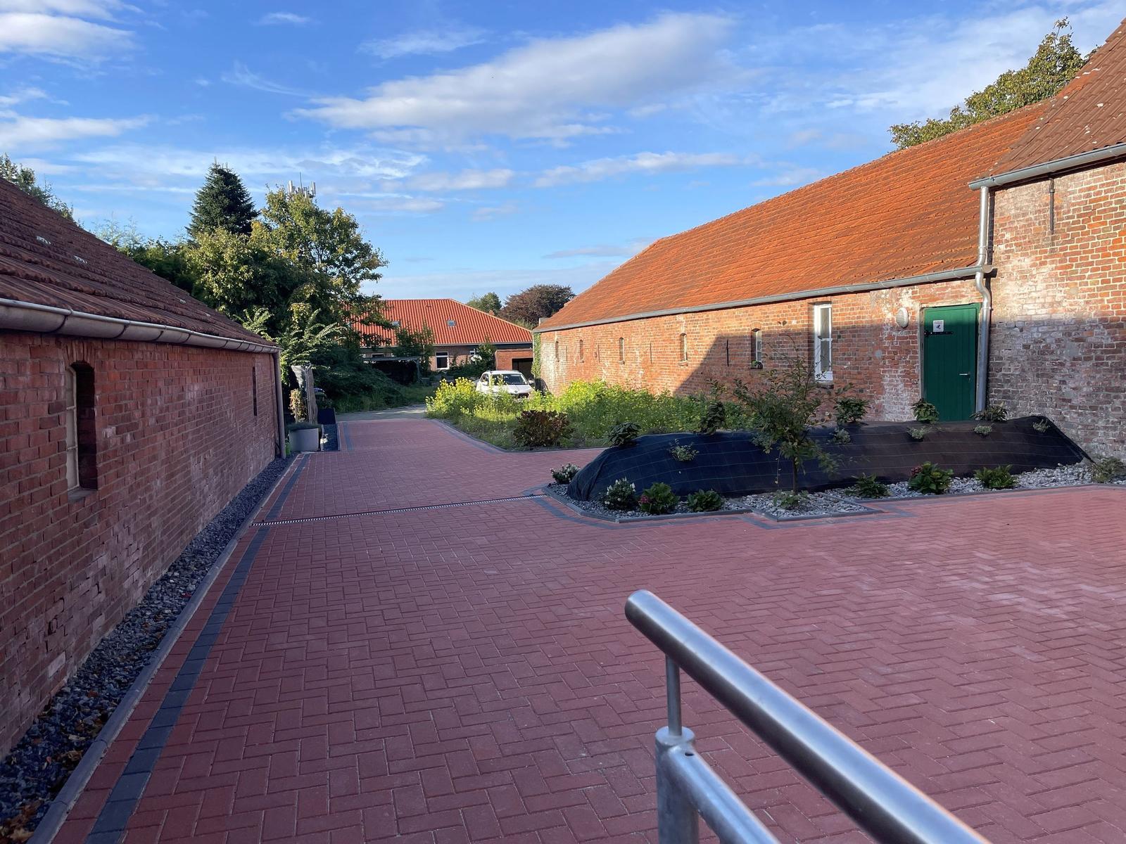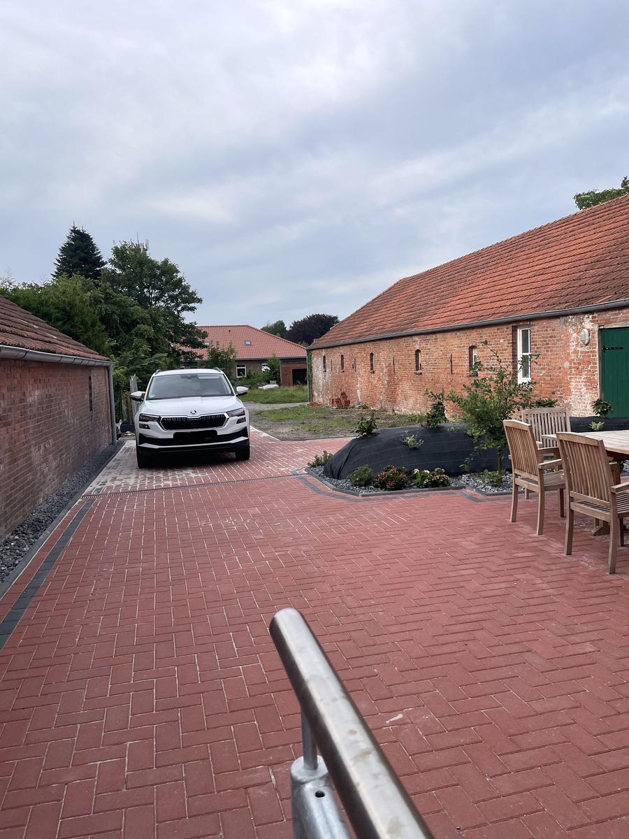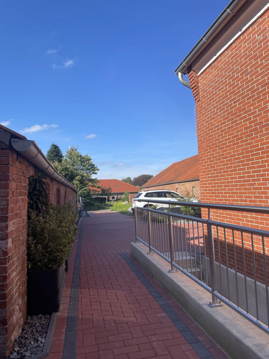 Die Ferienwohnung „Am Denkmal“ in Hage bietet einen einladenden Außenbereich mit einer großzügigen Terrasse, die mit hochwertigen Gartenmöbeln ausgestattet ist. Hier können die Gäste entspannen und die frische Luft genießen. Es stehen drei gepflasterte PKW-Stellplätze auf dem Grundstück zur Verfügung, sowie eine abschließbare Garage für mitgebrachte Fahrräder. Für die Kleinsten sind ein Bollerwagen und ein Kinderhochstuhl kostenfrei erhältlich. Die Unterkunft liegt zentral und ermöglicht den Zugang zu Einkaufsmöglichkeiten, Bäckereien und Restaurants, die fußläufig erreichbar sind. Auch der schöne Schlosspark Lütetsburg, ideal für Spaziergänge, befindet sich in der Nähe. Ob für entspannende Tage am Strand oder Ausflüge in die Umgebung, dieser Außenbereich ist der perfekte Ort zur Erholung. Die Unterkunft ist ab Februar 2025 verfügbar.