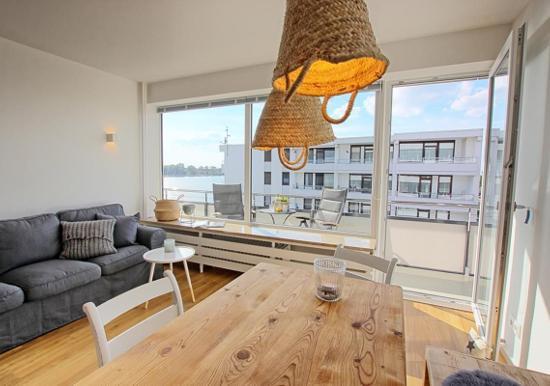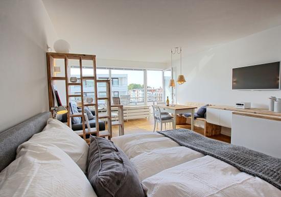 Von der Küche aus öffnet sich der Raum in das große, lichtdurchflutete Wohn-/Schlafzimmer mit Ostausrichtung. Hier haben Sie aus jedem Winkel des Raumes einen traumhaften Wasserblick.