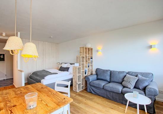 Der Wohnbereich ist geschmackvoll mit hochwertigen Möbeln eingerichtet und von hoher Qualität ausgestattet und dekoriert. Durch eine funktionale Raumaufteilung und wegen des großen Fernsehers können Sie sowohl von der Couch, als auch vom Bett aus das TV Programm genießen oder sich einen Film über BlueRay ansehen.