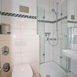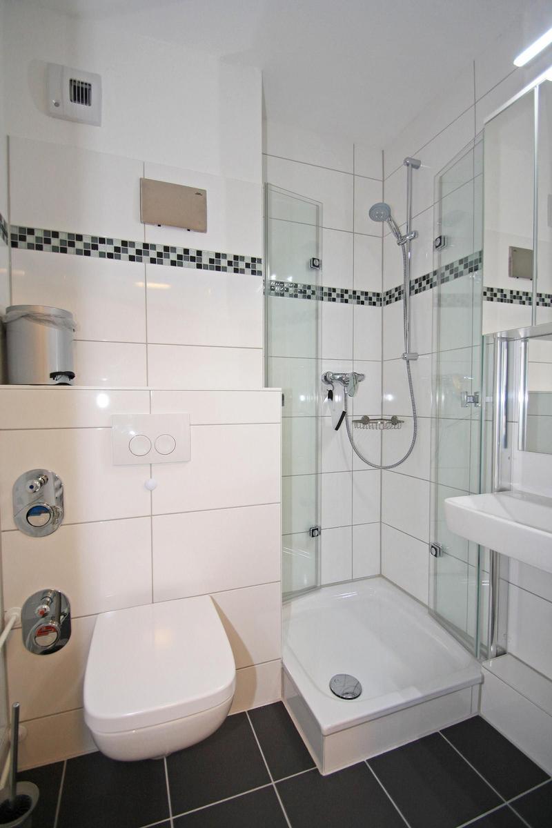 Das moderne Badezimmer ist mit einem WC sowie einer Dusche (Glastür, hoher Einstieg) ausgestattet.