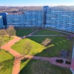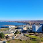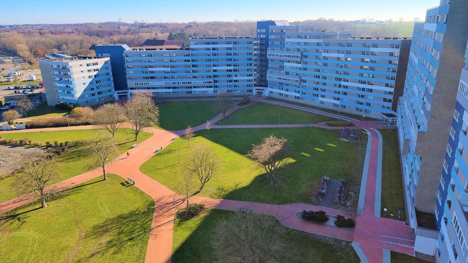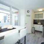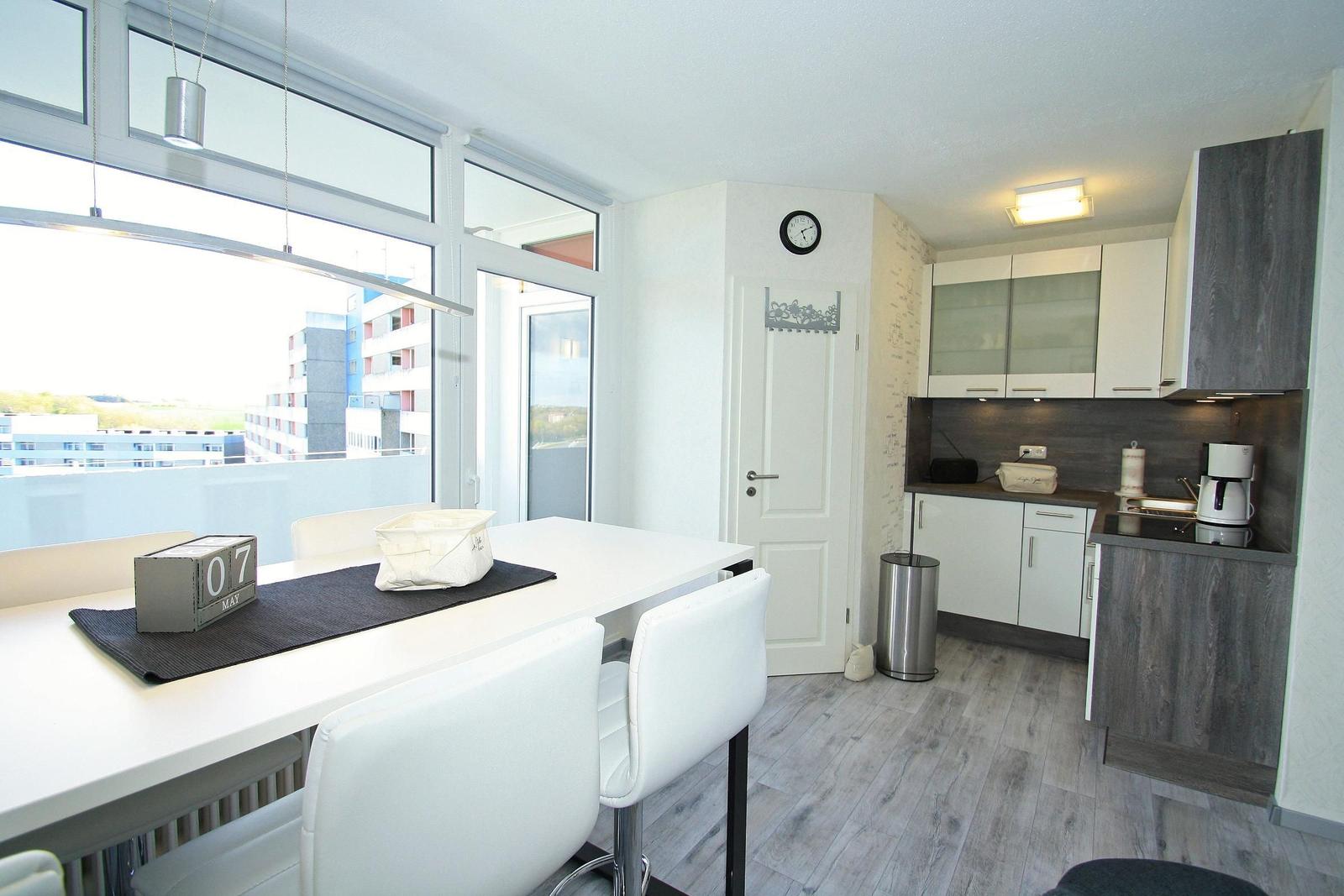 Der Essebereich, mit tollem hohen Esstisch sowie Barhockern steht direkt am Fenster. Hier schmeckt die Tasse Kaffee mit tollem Ausblick aus der 12. Etage ganz besonders gut.