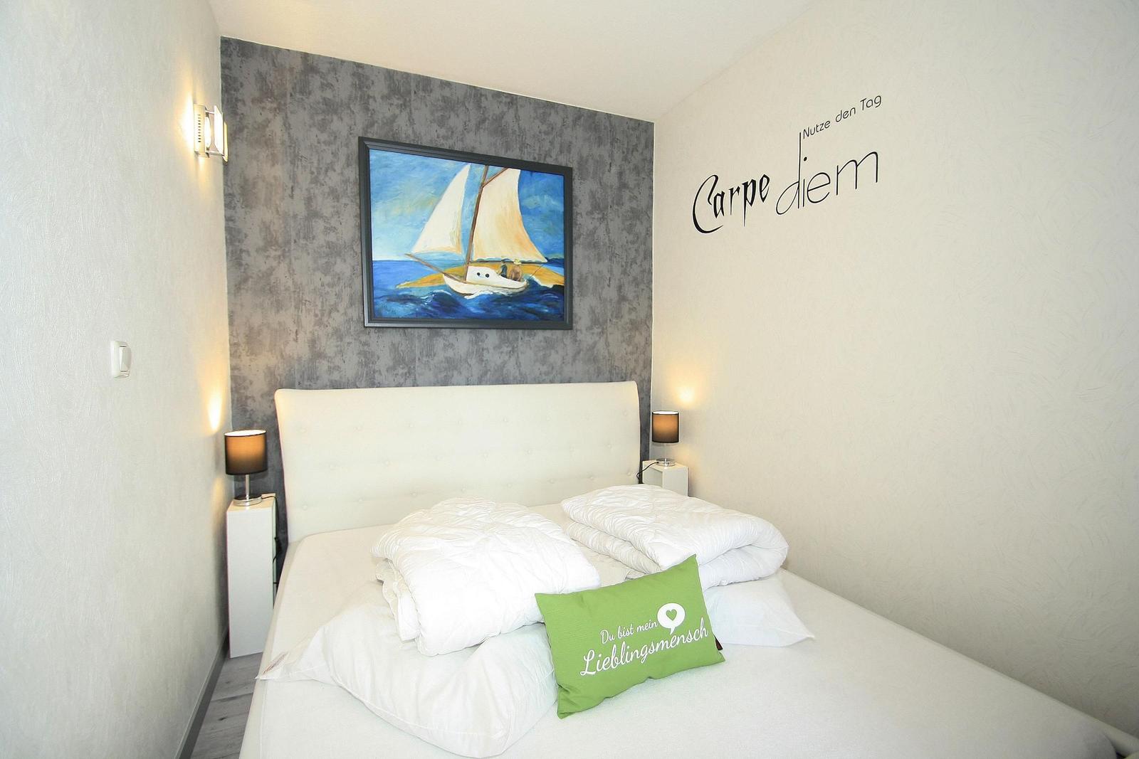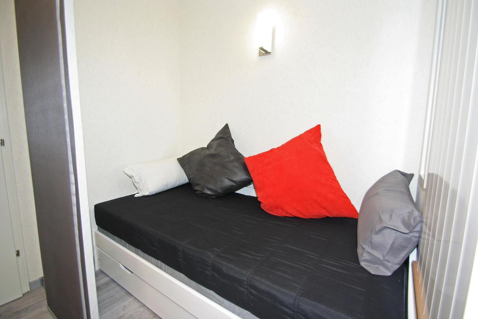 Der Schlafbereich, durch einen Schiebevorhang abgeteilt vom Wohnbereich, ist mit einem Doppelbett (durchgängige Matratze 160*200cm) ausgestattet.