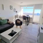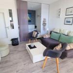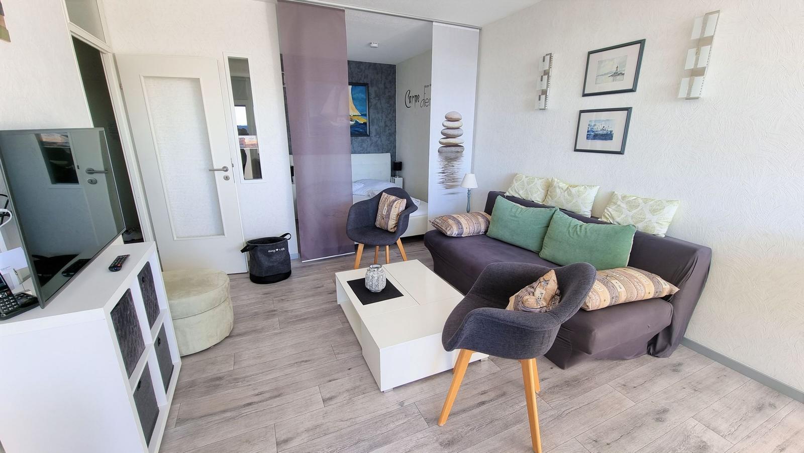 Der helle Wohnraum ist mit einem schicken Design-Vinyl-Boden ausgelegt und bietet Platz zum Sitzen für 5 Personen (1 Couch und 2 Sessel). Auf dem großen Flachbildschirm (102 cm)
