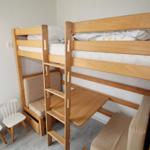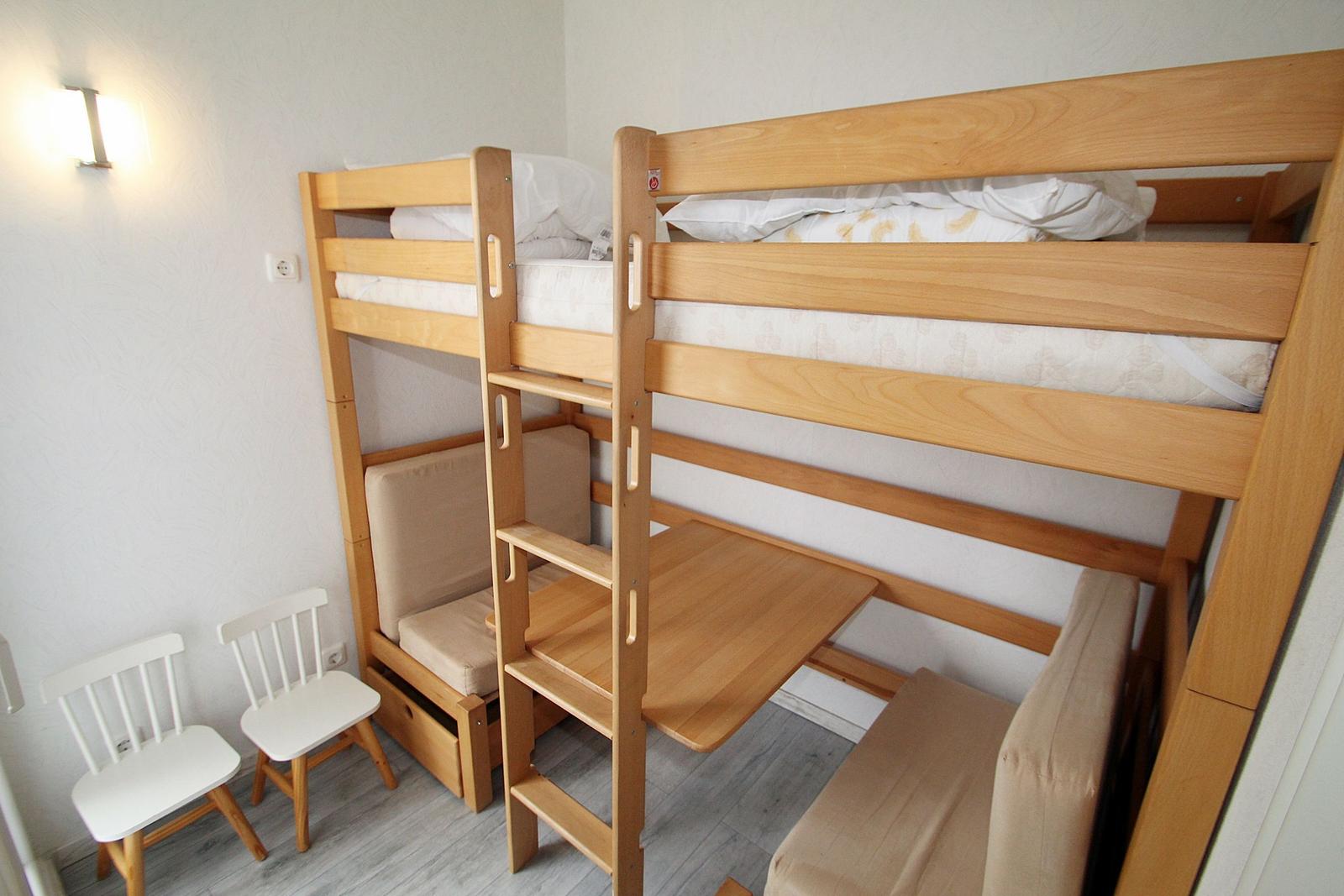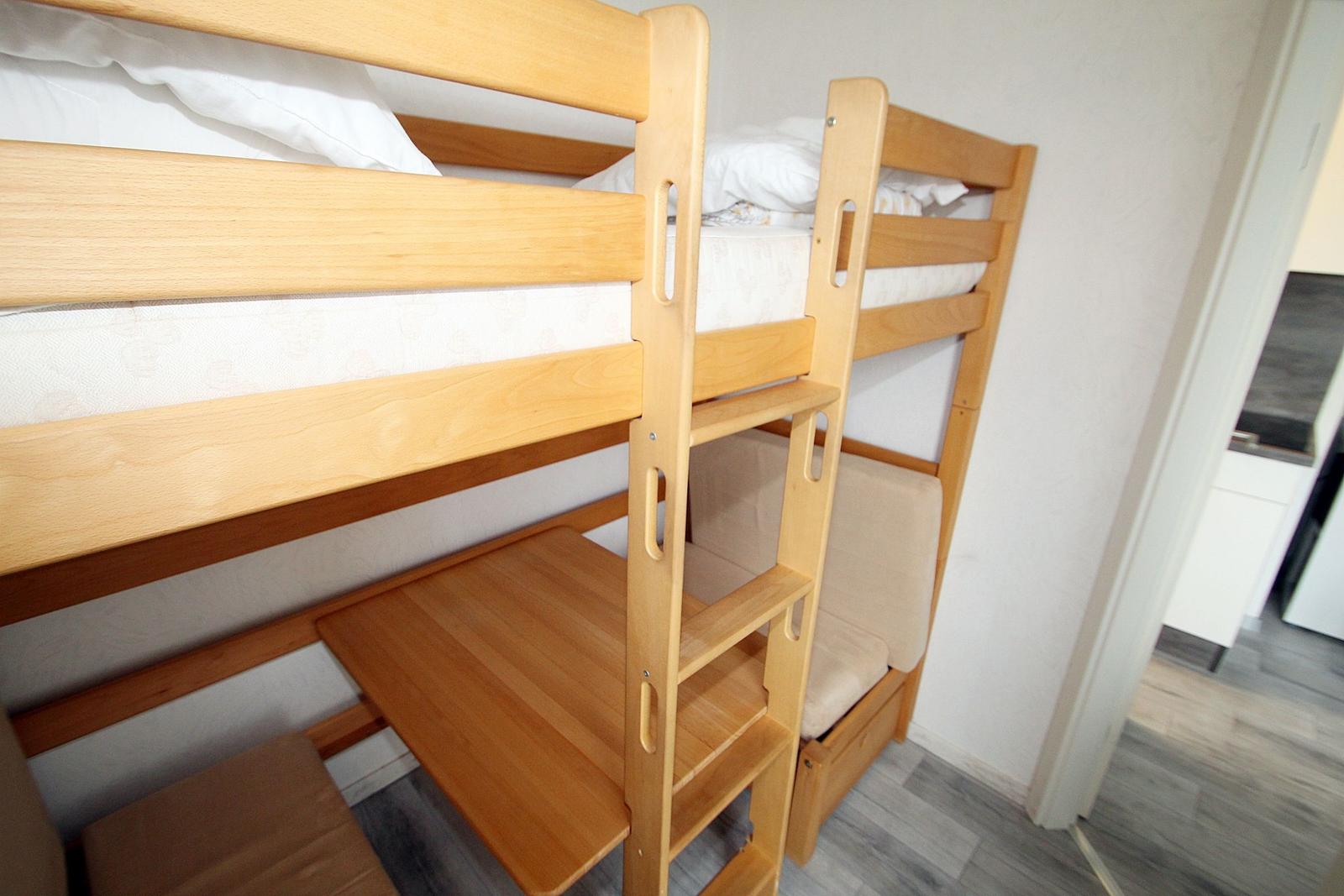 Das Kinderzimmer (vom Wohnbereich durch ein Tür getrennt) verfügt über ein Etagenbett -der obere Bereich 90*200). Im unteren Bereich kann die Sitzecke zu einer weiteren Schlafmöglichkeit umgebaut werden.