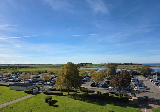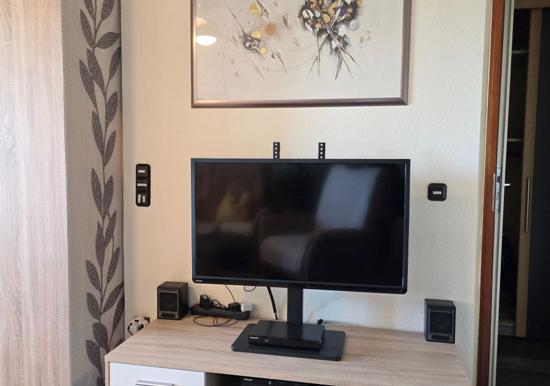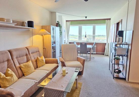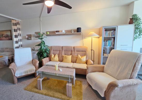 Wohnraum mit einer 2er Ledergarnitur und 2 Sessel, LCD-TV, DVD und USB-Radio. WLAN vorhanden.