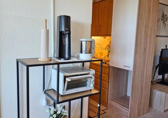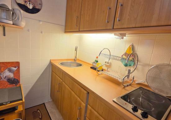 Die schicke neue L-Küche ist ausgestattet mit einem 2-Plattenherd und Mikrowelle.
