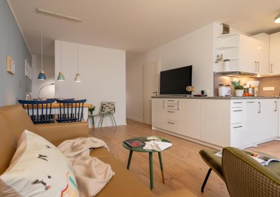 Die Wohnung mit W-Lan in der 8. Etage, verwöhnt Sie neben einem herrlichen Blick auf die Ostsee, mit vollständig neuem Interieur und allem Komfort, der Ihren Urlaub zu den schönsten Tagen des Jahres werden lässt. Das Wohn- und Esszimmer ist mit einem Flachbildschirm-TV und Blu-ray-Player, einer Bluetooth-Stereoanlage mit CD- und Smartphoneanschluss sowie diversen Filmen und Gesellschaftsspielen für jung und alt ausgestattet. Die offene Einbauküche verfügt über einen Kühlschrank mit 3-Sterne-Tiefkühlfach, Mikrowelle, 4-Platten-Ceranfeld inklusive Backofen und Dunstabzugshaube, Geschirrspüler, Kaffeemaschine, Wasser- und Eierkocher, Toaster und einer vollwertigen Küchenausstattung für 6 Personen. Im separaten Schlafzimmer, mit Ausblick auf Landschaft und Naturschutzgebiet (Außenjalousie vorhanden), finden Sie ein Doppelbett (180x200) und einem zweiten Flachbildschirm-TV sowie eine großzügige Kommode mit Auszügen vor. Im Kinderzimmer steht ein himmelblaues Etagenbett (90x190). Im Badezimmer wurde eine bodentiefe Dusche mit einer Vollglas-Duschkabine verbaut. Ein Ober- und Unterschrank bieten ausreichend Stauraum und zusätzlich liegt dort ein Föhn für Sie bereit.